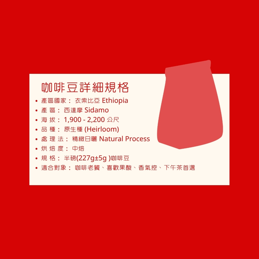 來自咖啡發源地的古老高原,在赤道陽光的親吻下自然熟成。採用傳統日曬工法,完美封存了西達摩產區標誌性的豐富果香與細膩甜感,是熱愛莓果調性與層次感的精品咖啡玩家必備收藏。
