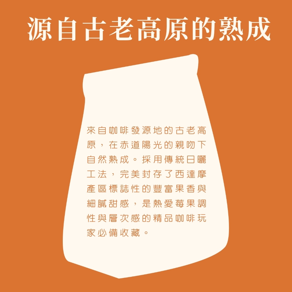來自咖啡發源地的古老高原,在赤道陽光的親吻下自然熟成。採用傳統日曬工法,完美封存了西達摩產區標誌性的豐富果香與細膩甜感,是熱愛莓果調性與層次感的精品咖啡玩家必備收藏。