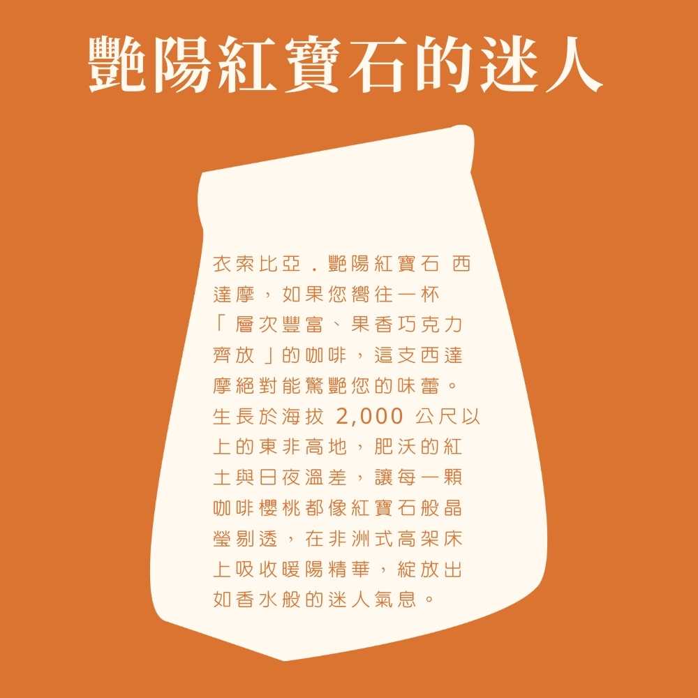 來自人類搖籃的恩賜:衣索比亞.艷陽紅寶石 西達摩 如果您嚮往一杯「層次豐富、果香巧克力齊放」的咖啡,這支西達摩絕對能驚艷您的味蕾。