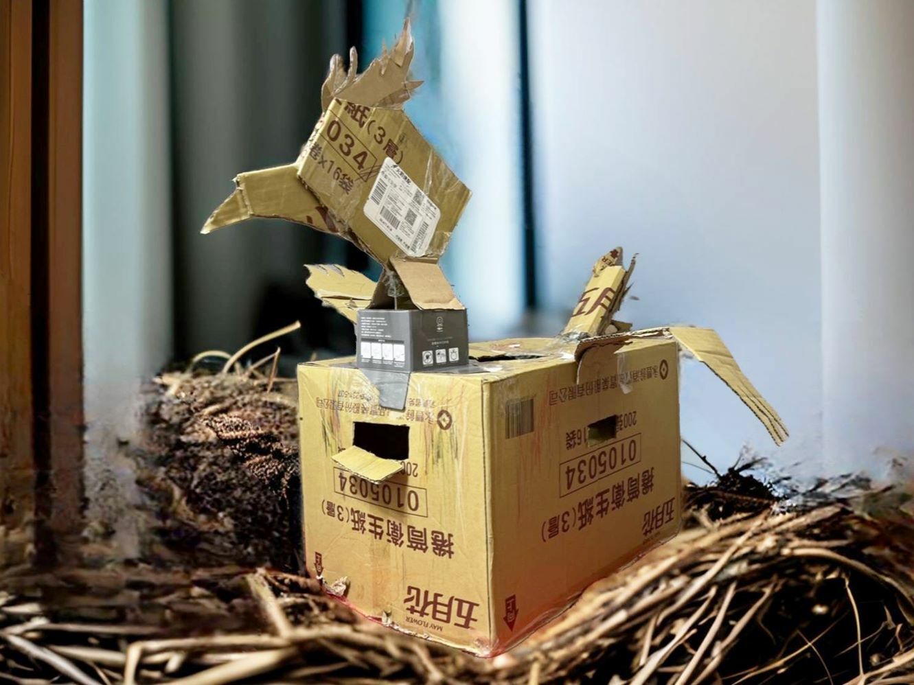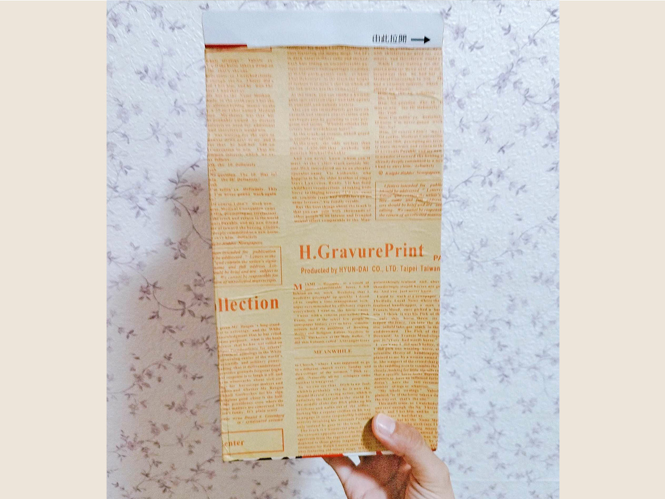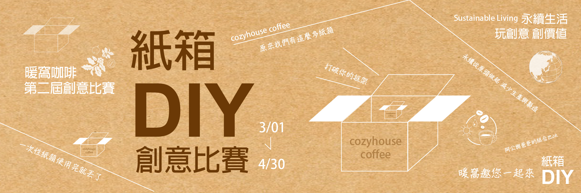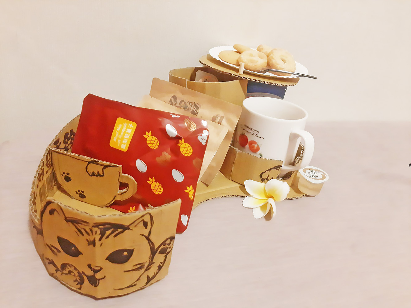 1. 回收紙盒切割折疊、再使用郵寄包裹的貼紙回收以及外帶咖啡杯上的回收膠帶黏貼,沒有消耗任何新物料。