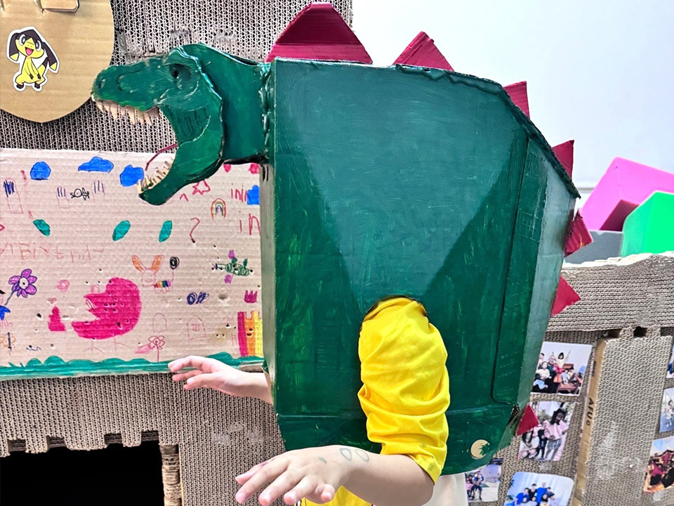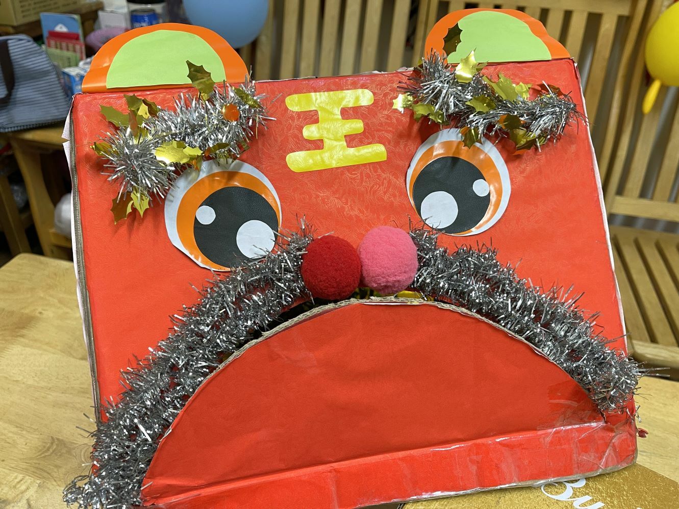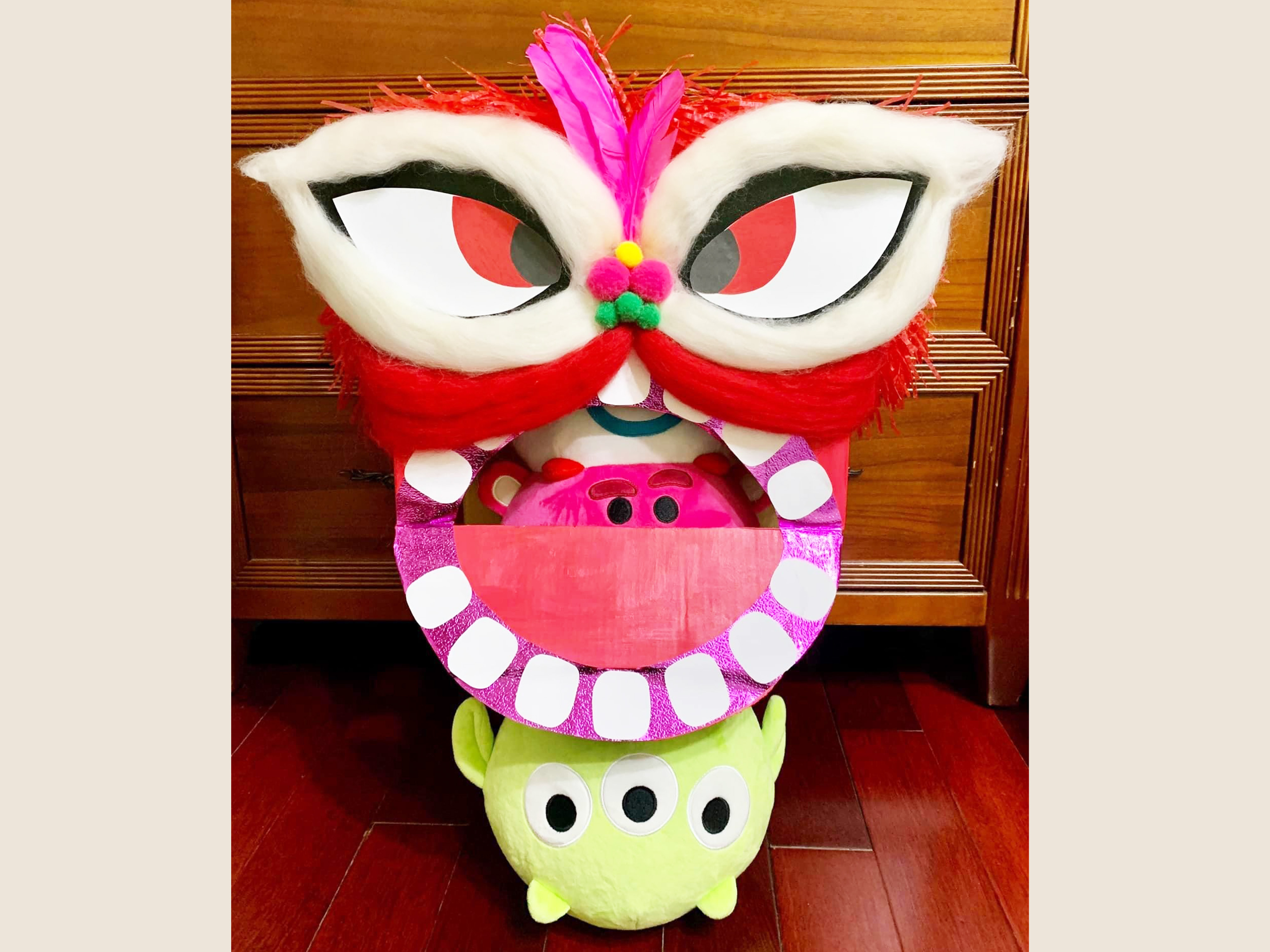 我是幼兒園老師,平時為了教學、佈置,經常會利用紙箱及隨手可得的物品廢物利用,經加工後就能成為新玩具、佈景……。曾經在聖誕節用紙箱拼湊、黏貼、上色,做了一個壁爐。這次為了讓孩子能有濃濃的年節氣氛,我特地製作舞獅搭配喜氣洋洋的音樂,讓班上寶貝能一起上台表演一段給全園的孩子觀賞。原本想購買,但覺得自己製作更具意義、更有溫度~我用紙箱作為獅頭的主體,修剪成想要的形體、使用壓克力上色,再用羊毛氈塑型當眼睛,以兩個紅彩球固定作為飄逸的頭髮,其他小裝飾就用紙剪貼,最後用紅布縫上鈴鐺、毛線裝飾,成品出乎預料地吸睛,自己非常滿意。孩子們表演完、拍拍照也很有意境呢!班上的孩子們跟了我三年也愛上創作,收集紙盒、玻璃罐、牛奶罐來DIY,他們也是我最得意門生💗