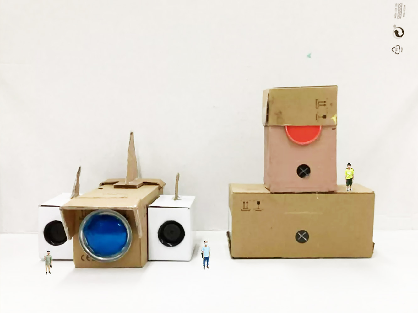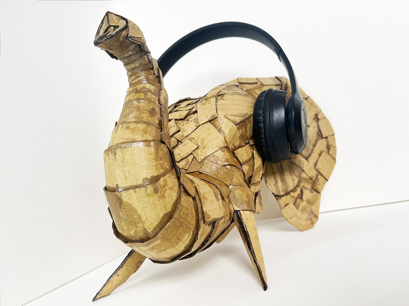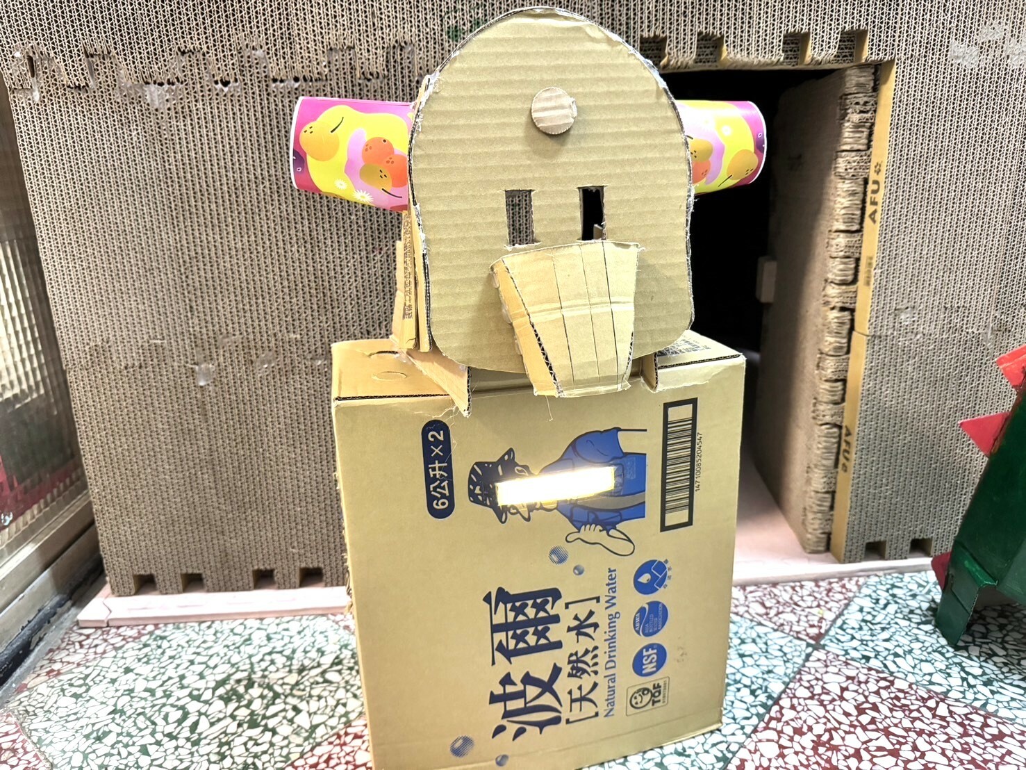 小時候就很喜歡紙箱藝術家鐘凱翔的作品,看到他用著裝菜裝水果的紙箱完成了許多鬼斧神工的作品,真的很驚艷到我,但礙於課業上的繁忙真的很難有時間來完成些什麼,但有天無意間的看到了紙箱DIY比賽,於是我終於有了一個藉口可以來做東西,而且正在努力收集作品和比賽經驗的我,馬上就決定了要參加,於是我花了兩個禮拜的時間完成了【耳機裡的大象】名子是來自一句諺語 房間裡的大象 意思是對於某件明顯卻被集體視而不見的事物是一種不敢反抗問題的迷思,而我的創作理念是,現在環保已經是全世界的大家都認同的問題了,但還是有人會把愛地球不當一回事,就像一隻不理不睬的大象,帶著耳機袖手旁觀。