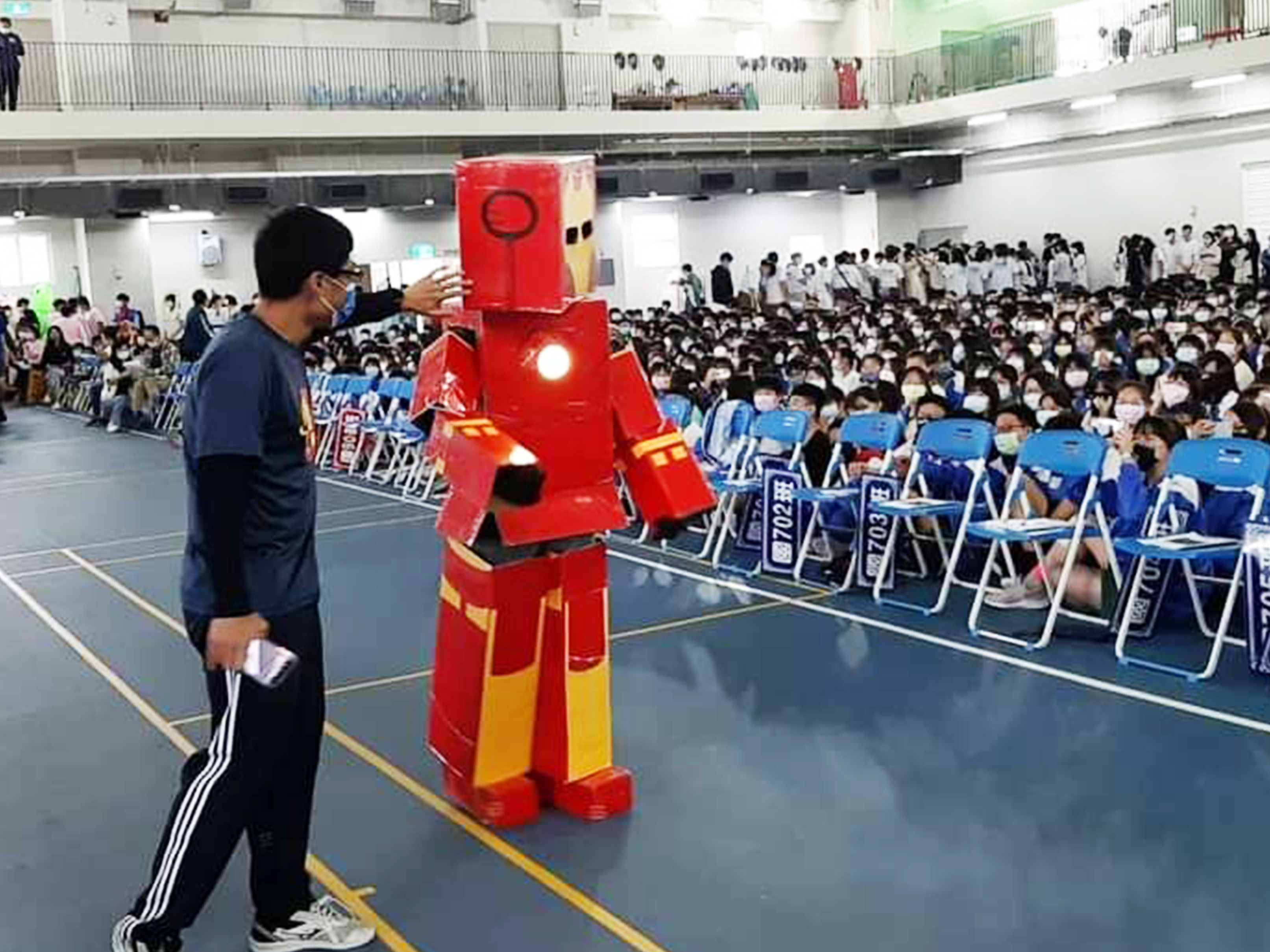 高一創意進場的時候,我跟孩子們希望可以在進場的時候,可以有一個能代表班上的吉祥物,但我們又不想買現成的,因此我們決定用電腦教室裡面裝主機的紙箱,希望可以製作一個能代表班上的鋼鐵人,然後找一個最帥氣的男生,穿起這身裝備,跟著大家一起進場(本來還想站在滑板上,但操場根本滑不動,後來只好站在推車上,帥氣登場),後來同學還加上了胸前發光的巧思,根本帥翻全場。