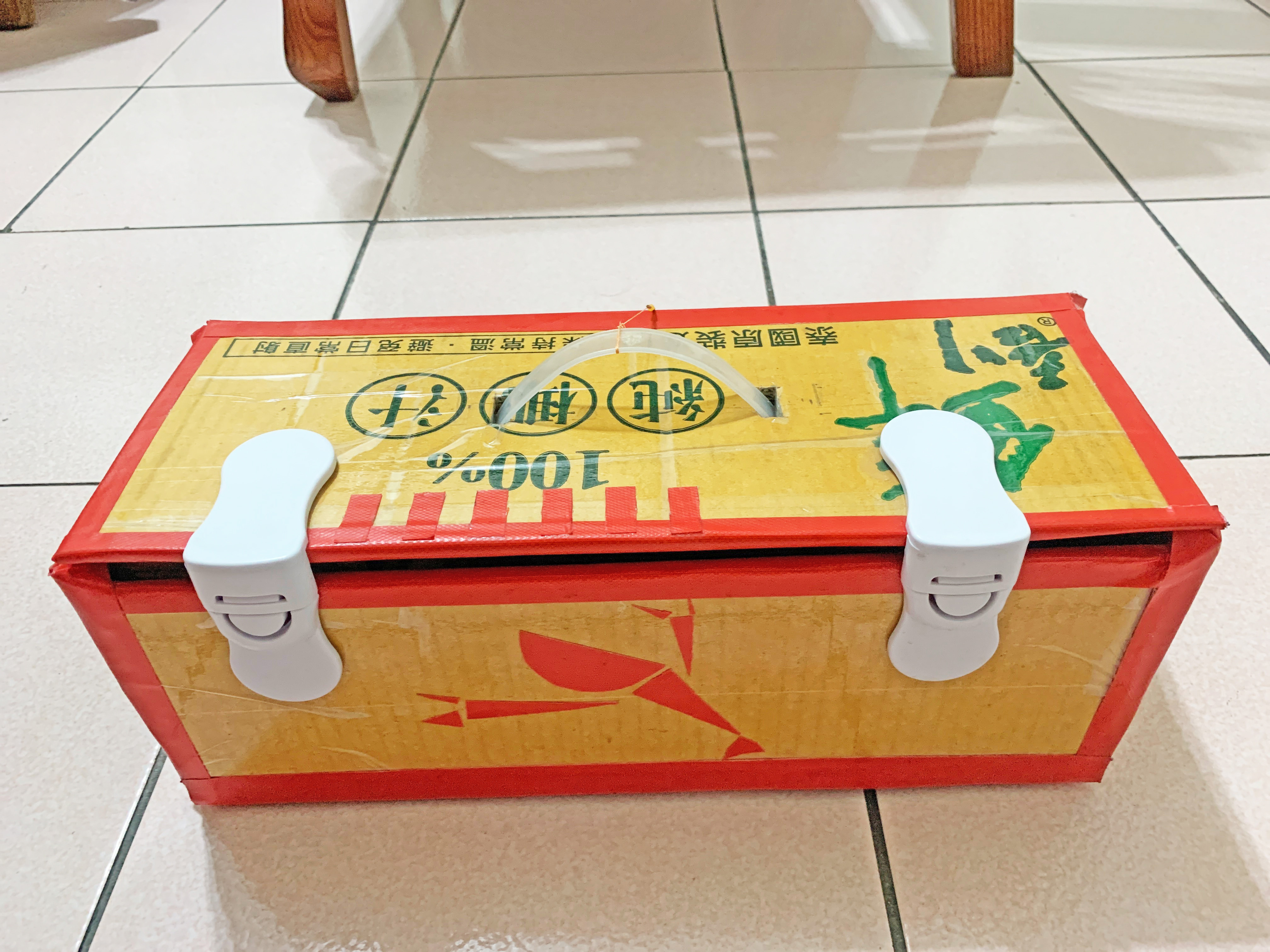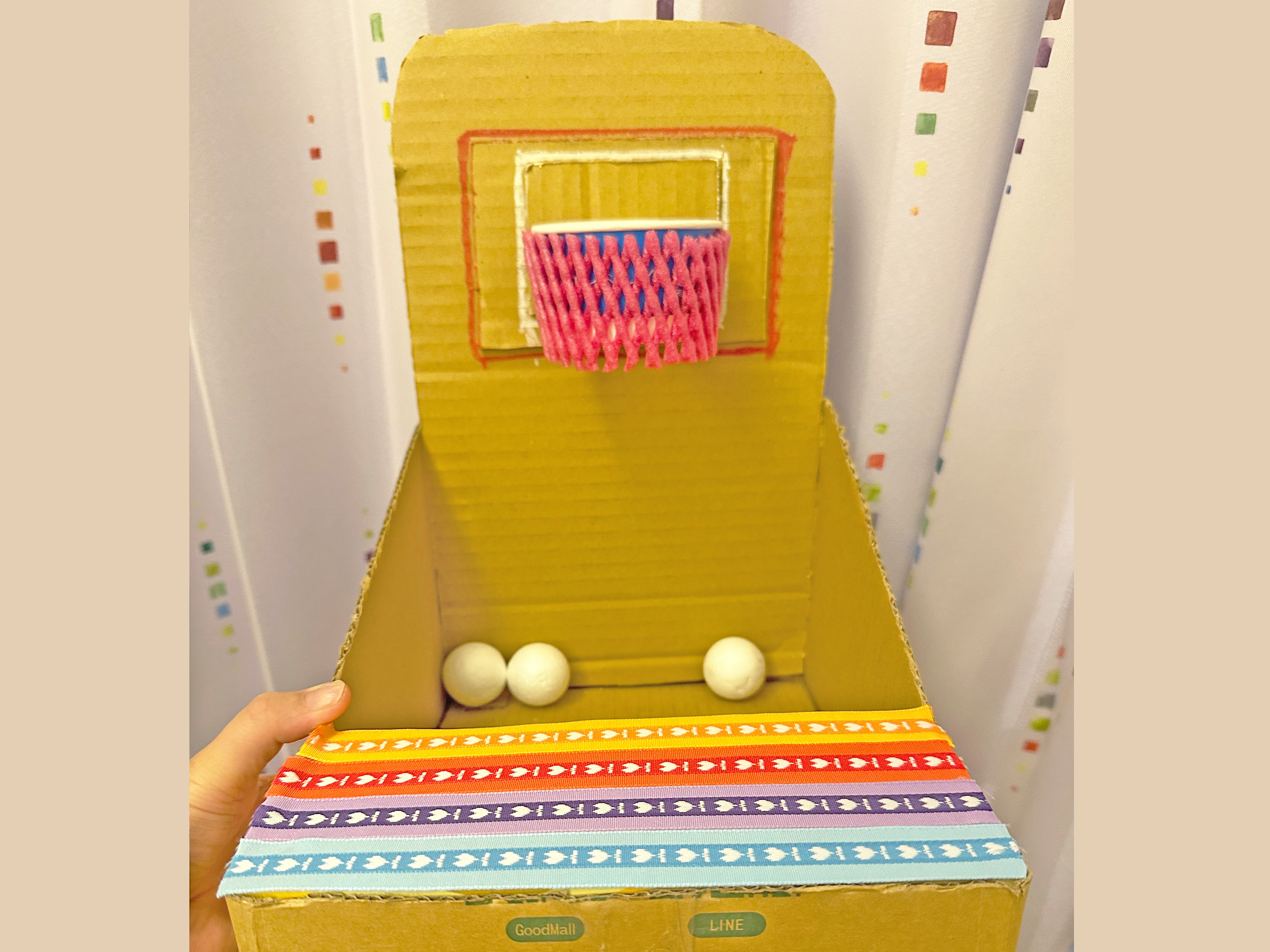 廢棄的紙箱經過切割後成為陪伴孩子成長的玩具,製作過程需要注意不要讓孩子有機會割傷,所以邊邊角角我都剪成圓弧型。為了讓還沒學會站之前的小嬰兒在俯臥、爬行階段也能有有趣的玩具,我想到製作小型的投籃機訓練手指靈活程度;如果是國小的大童,可以親子一起規劃、繪圖,動動手一起做手作完成較大型的投籃機。