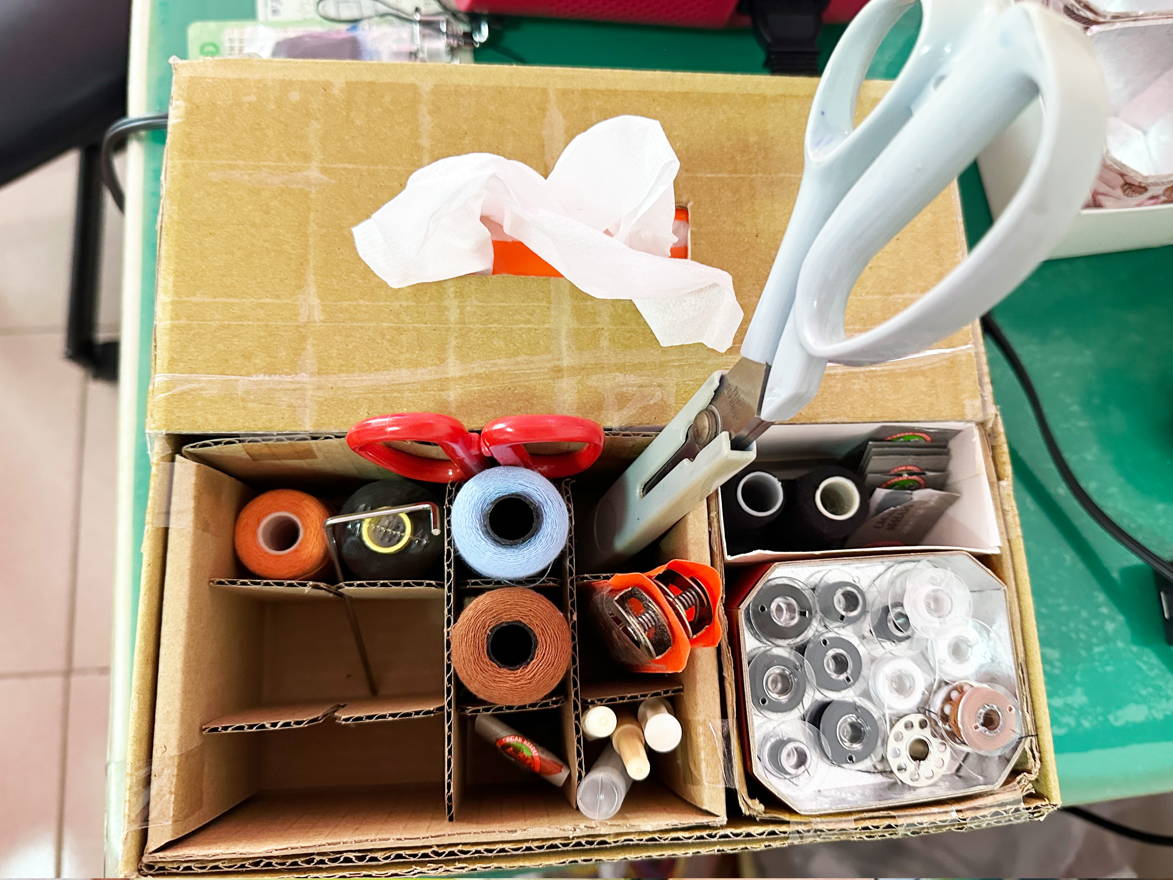 因為喜歡裁縫,需要收納線材和工具,有時放桌上也會使用衛生紙,因此製作旁邊可放入抽取式衛生紙的空間放入;有時也能變換放置物品,例如:收納盒放在客廳就可放遙控器、筆……等物品,一個收納盒可以放很多不同的小工具!