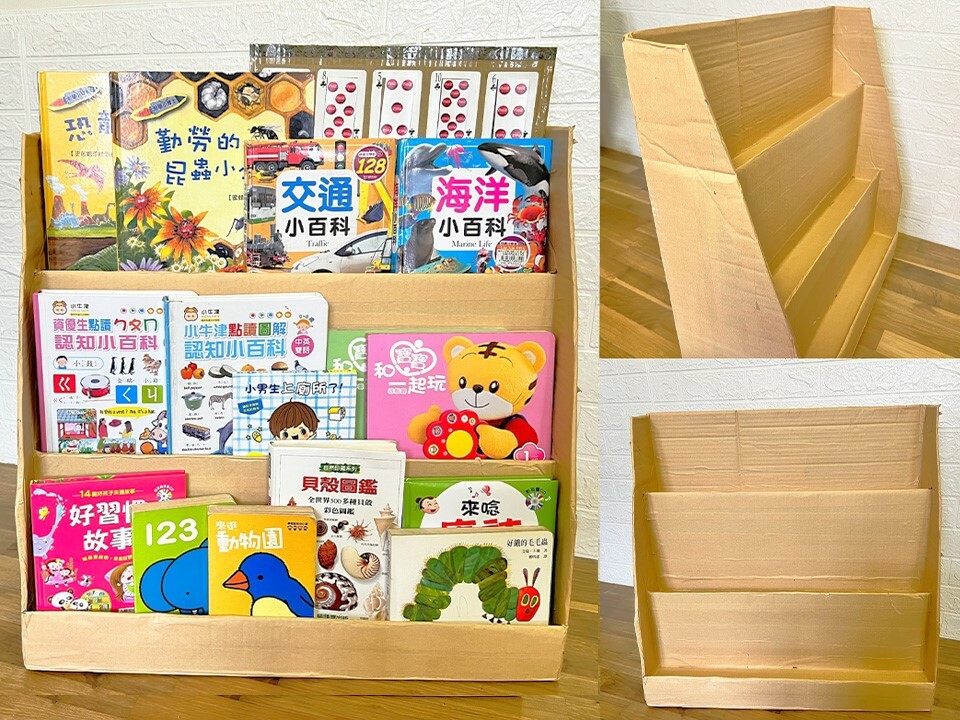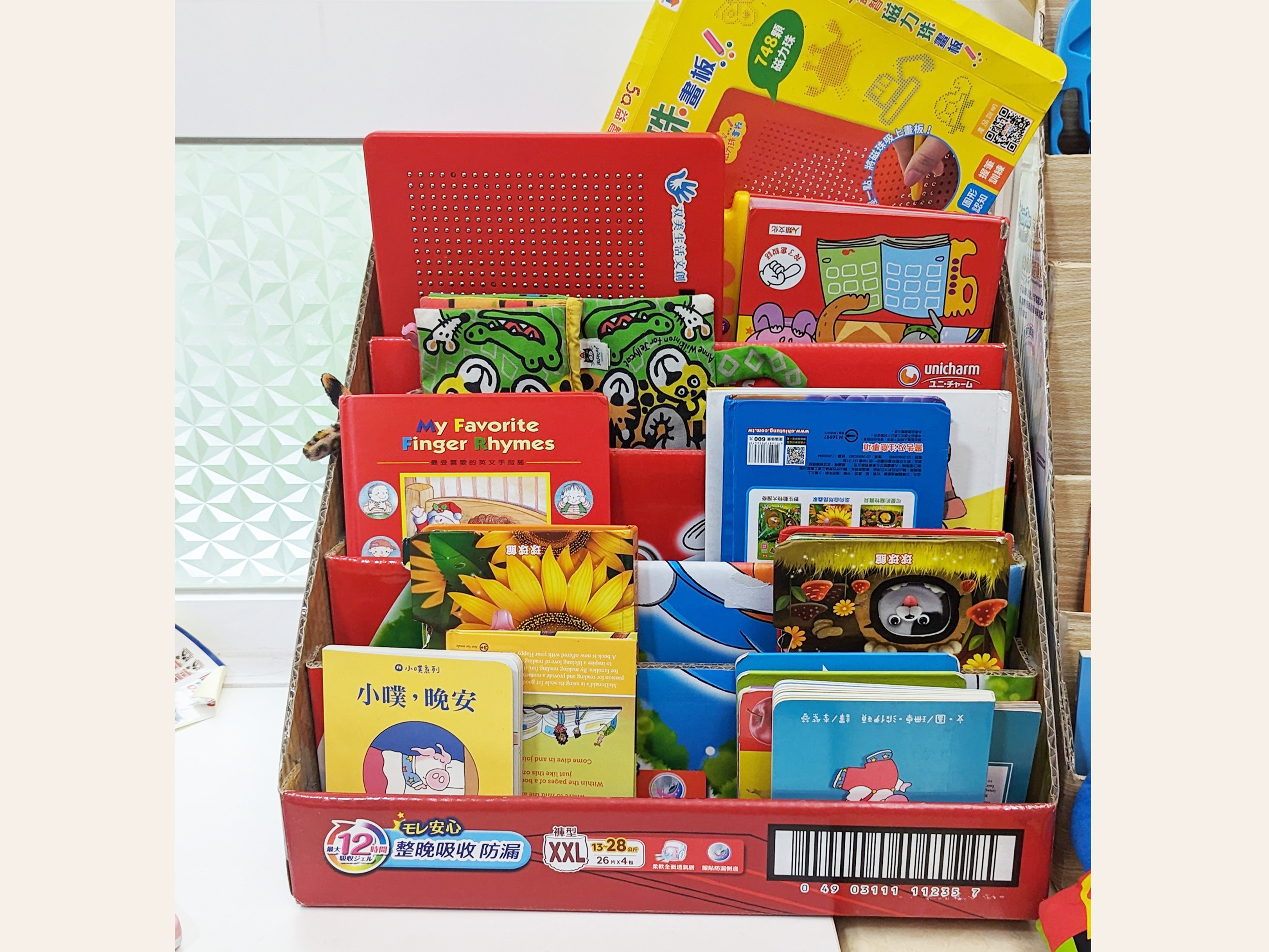 家中的圖書量越來越大,透過寶寶的尿布箱重複利用製作成展示書櫃,讓寶寶養成自行收納的習慣!