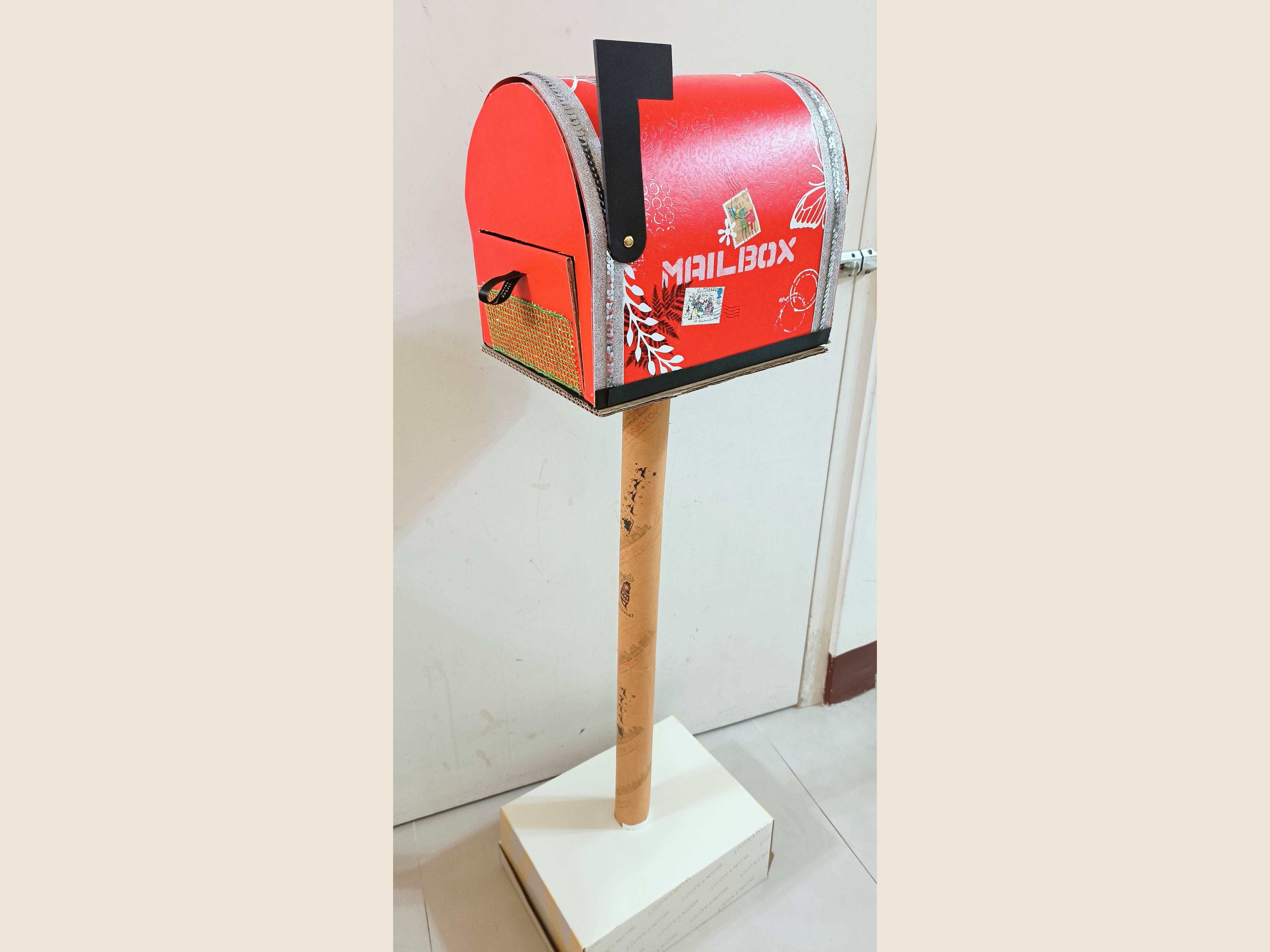 多久沒寄信了?寫一封充滿文字的情感,貼上一符顯微世界的郵票,抱著盼望丟入郵筒後,每天期待收到回信。這樣的心情,現在的孩子體會過嗎?不如寫信給未來的自己,或是任何你想頃訴的對象,只要丟進這個信箱裡,過三天再打開,就會收到回信喔~~ 材料是普通的回收紙箱,熱熔膠,紅色和咖啡色卡紙。媒材是印章、紙模、模板和modeling paste。 製作時間為兩天。