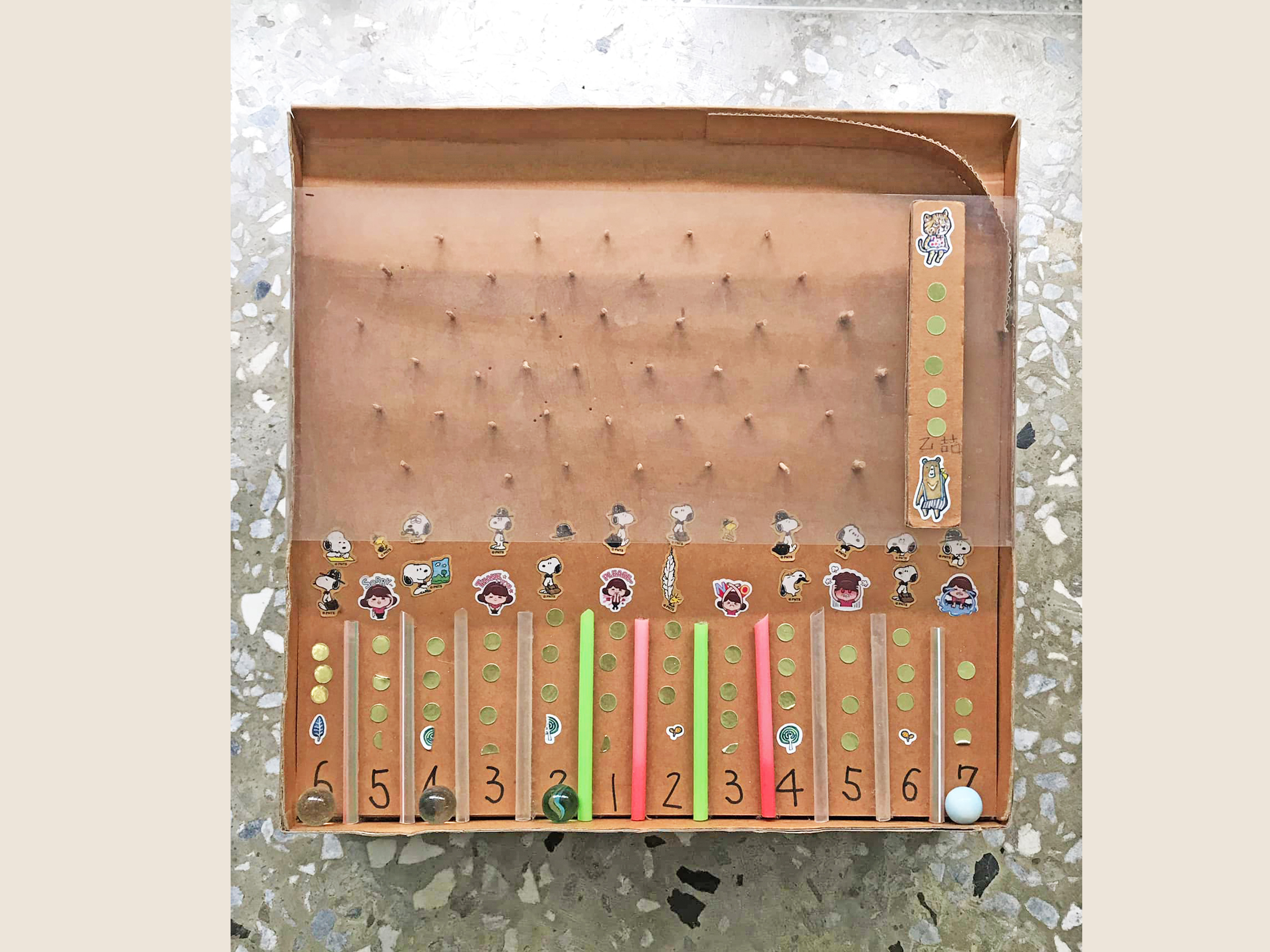 想給小孩一個與家人朋友互動或個人遊玩的遊戲 所以就創作了這個的彈珠臺 材料使用紙箱/竹筷/吸管/瓶蓋/膠帶紙捲 再用麥克筆做點綴成微微工業風格 大約花了快一天的時間製作。