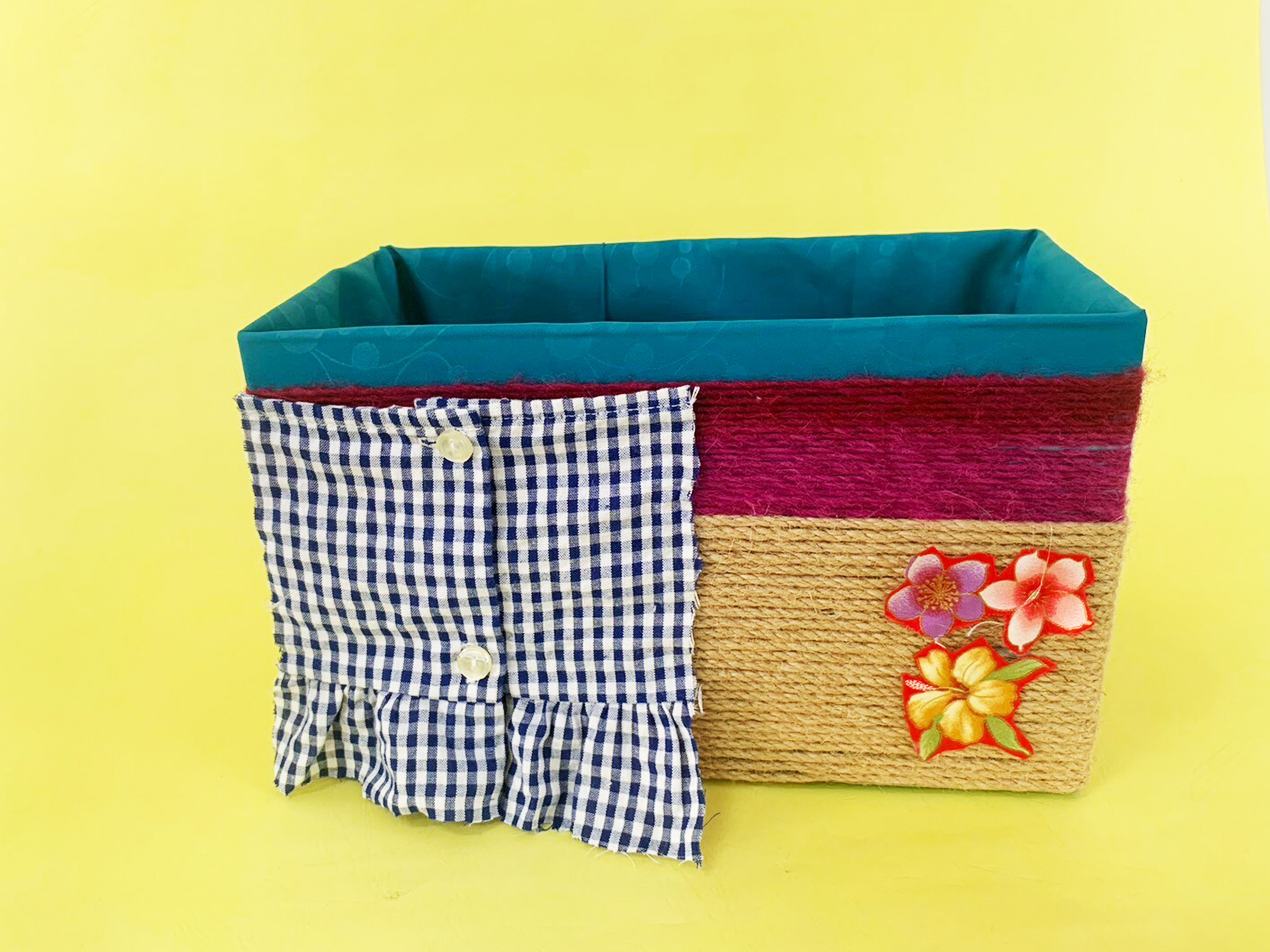 在關懷據點人員帶領下,學習生活中可以做更多的物品再生,不適簡單的切割利用,而是結合藝術美感,將作品更具有耐看及實用性,透過快遞紙箱重組,加上家中廢棄的兒童舊衣、毛線、麻繩,重新製作成好看又實用的收納箱,透過纏繞方式加上黏貼舊衣,一個可愛又顏色多樣的收納箱就完成了。 希望從一個小紙箱帶大家更能有環保、再生的念頭進入生活中。