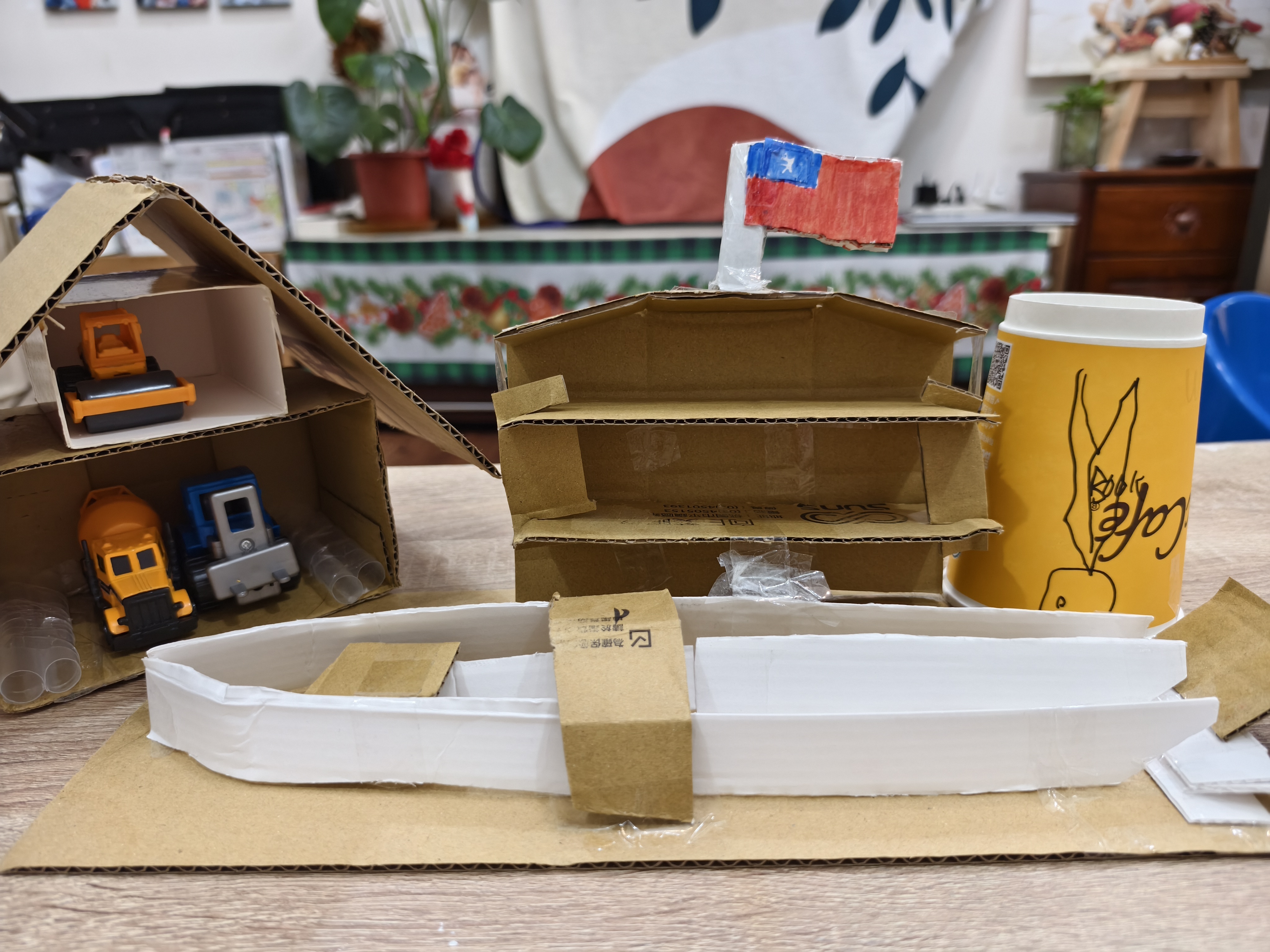 3.製作方式:我們從學校收集廢棄紙箱,裁剪紙板,查詢影片 ,跟著影片一一組件,最後運用廢紙來包裝。