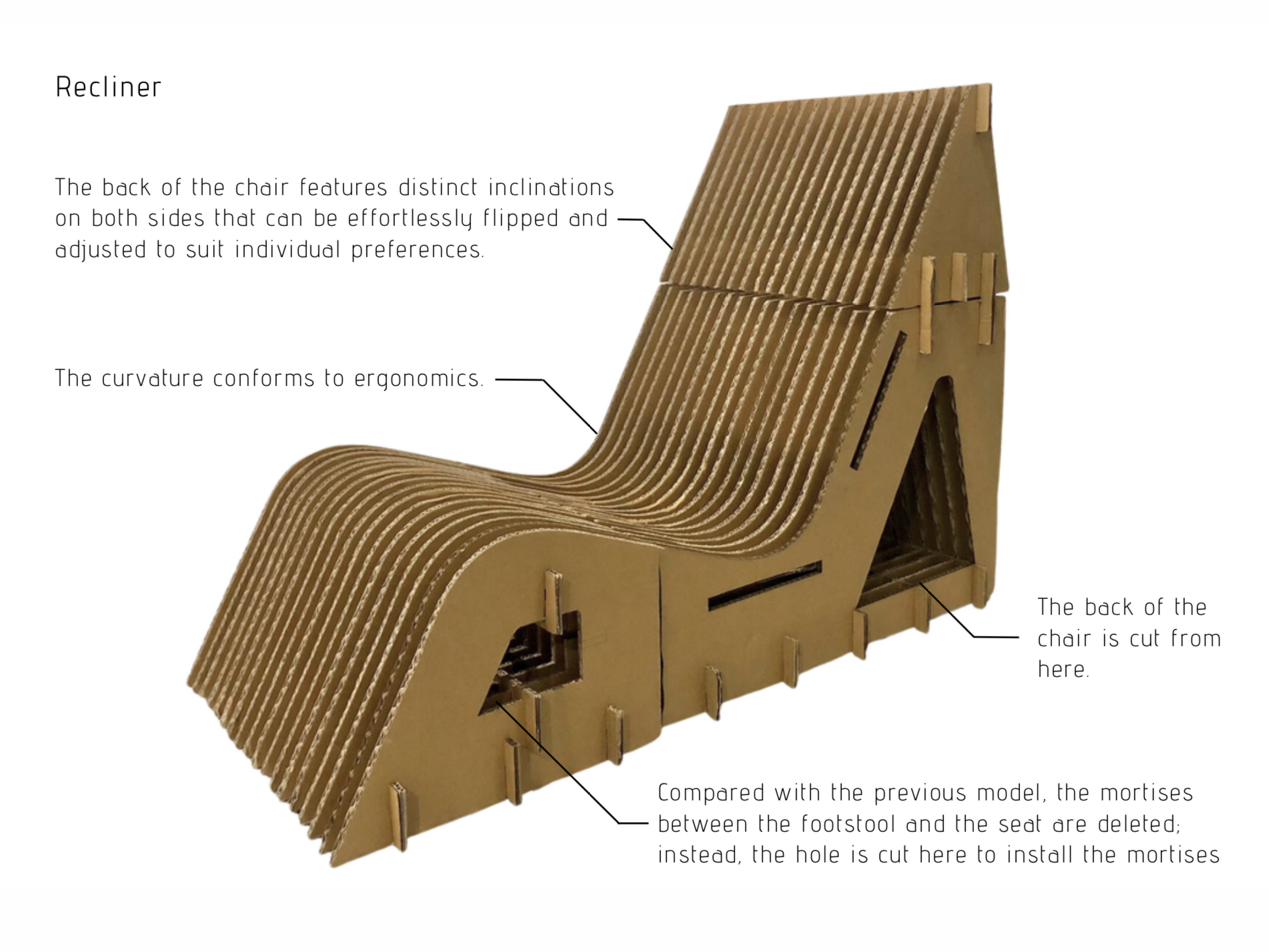 整張椅子材料純粹,由數片尺寸相同的矩形紙板經裁切組裝製成。 透過反覆排列,搭配卡榫卡扣固定,使椅子免用其他材料或膠著劑,即可支撐人體重量。 最大限度地提高材料使用效率,也營造出優美的視覺效果。 椅子曲線亦經過人體尺度設計而得。 座椅可透過不同組裝方式變成躺椅,椅背角度也可輕鬆轉換, 讓使用者能以最舒適的姿勢坐在椅子上。
