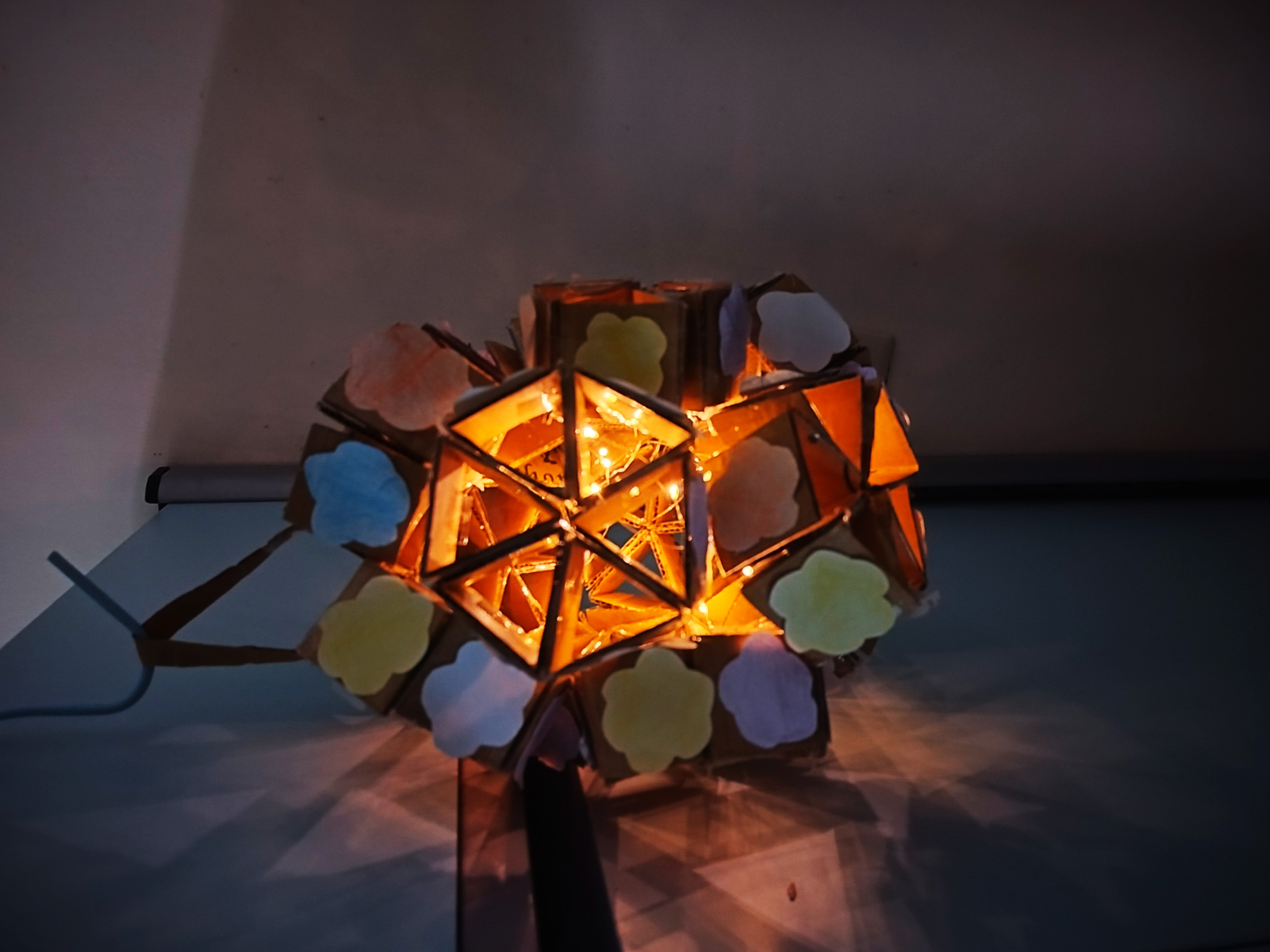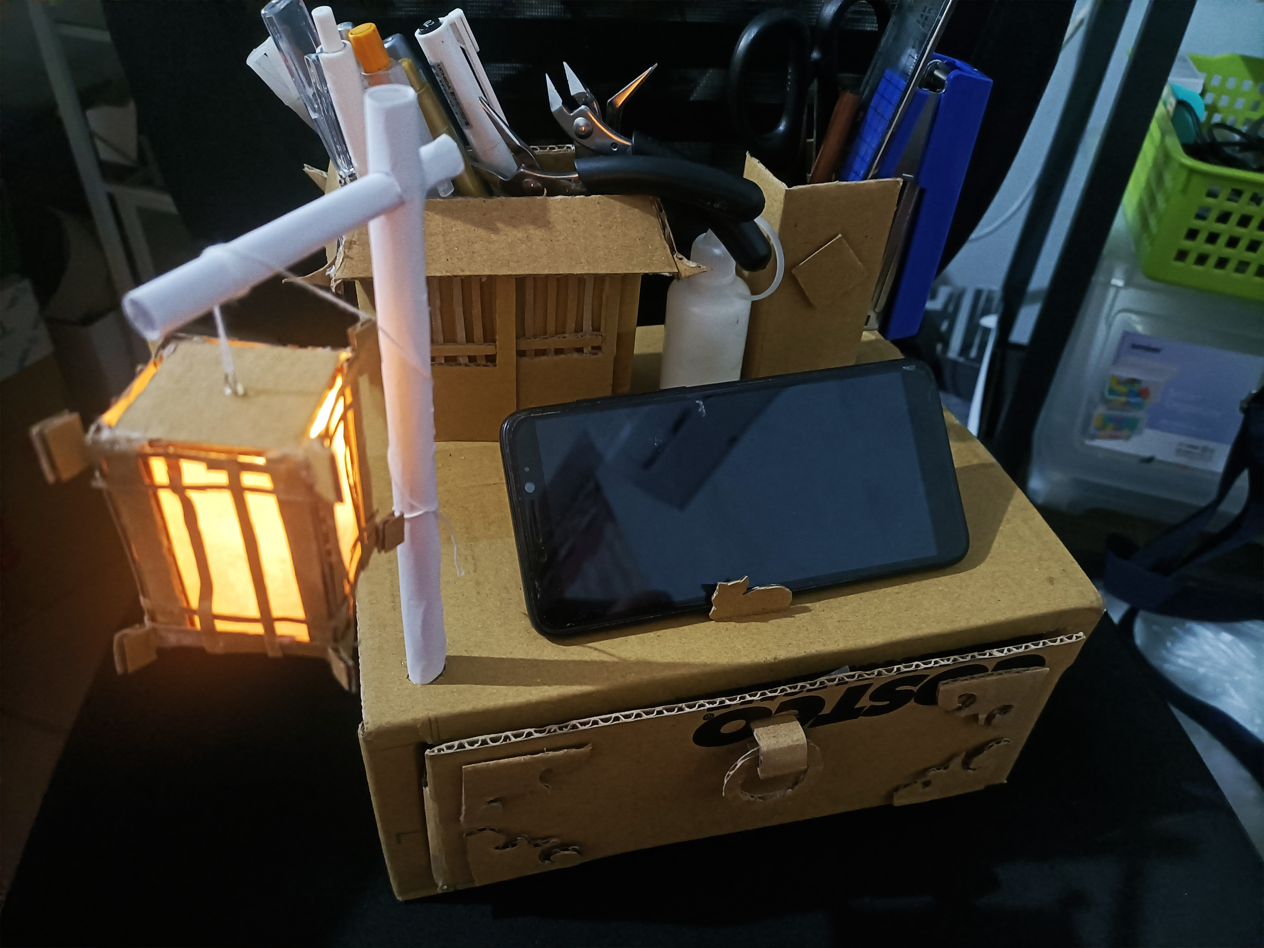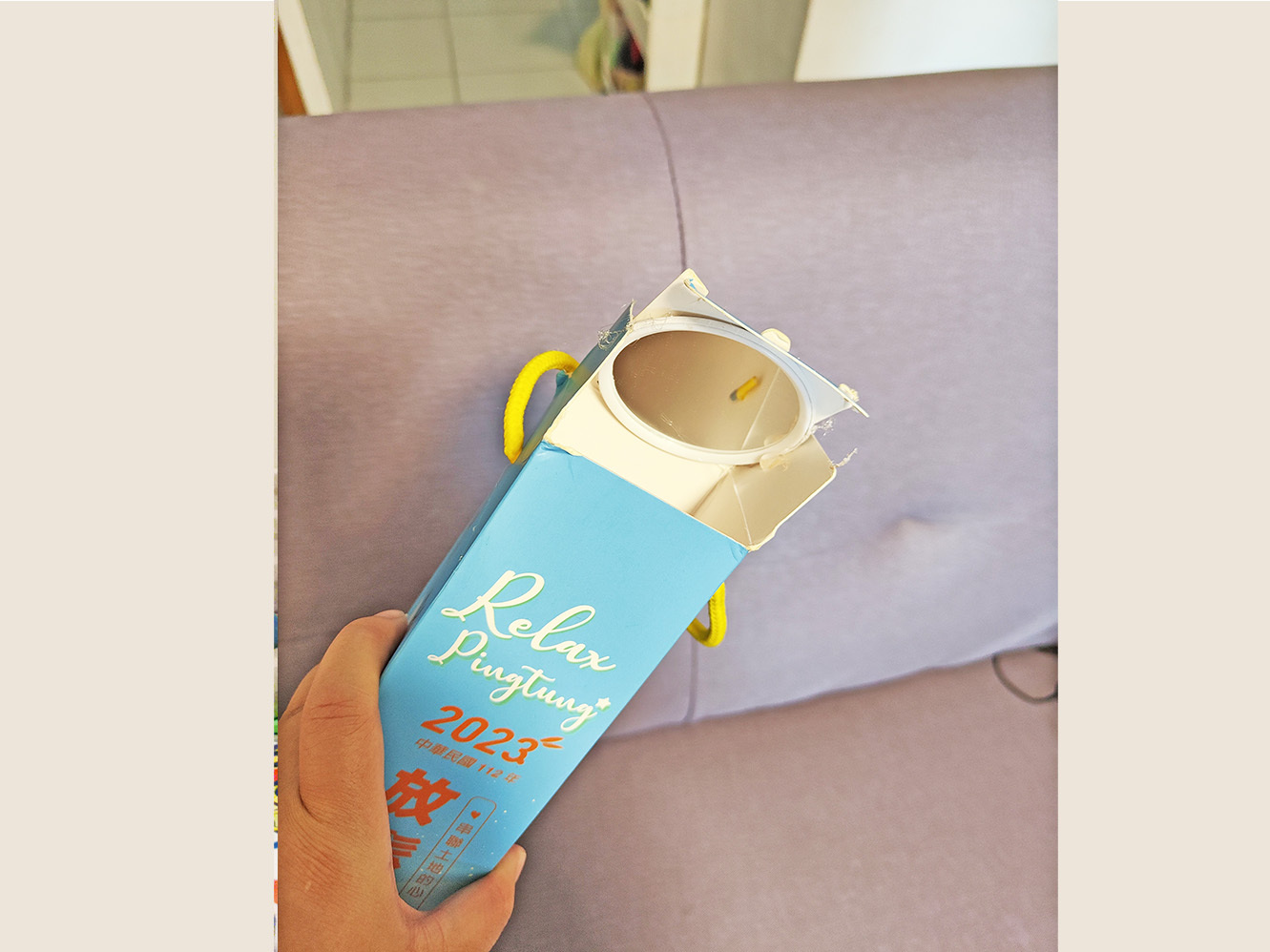 1.創作緣由:因為想到半夜會害怕黑,所以想到可以利用紙箱做一個花燈也是一個夜燈