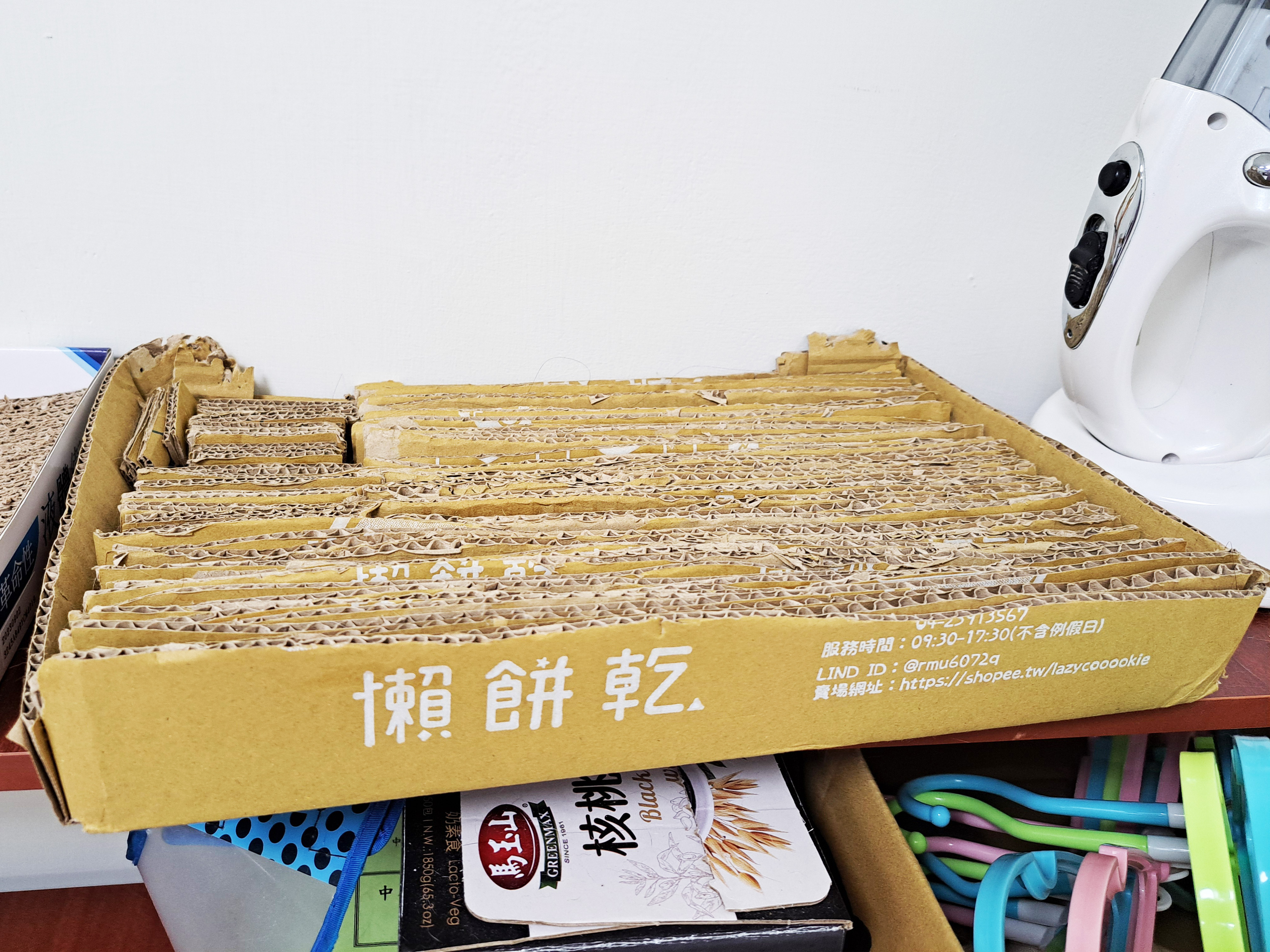 養貓咪的我,每個月都會買寵物用品,不管是貓砂或是飼料甚至是罐頭,我都使用網路購物,所以都會有很多紙箱,有些紙箱品質不錯,丟掉很浪費,一直留著又佔空間,而我想到最實用的就是貓抓板,但貓抓板又會掉屑屑,所以我就量身訂製,讓貓抓板能放進紙箱,可以蒐集紙屑跟貓脫落的指甲片。