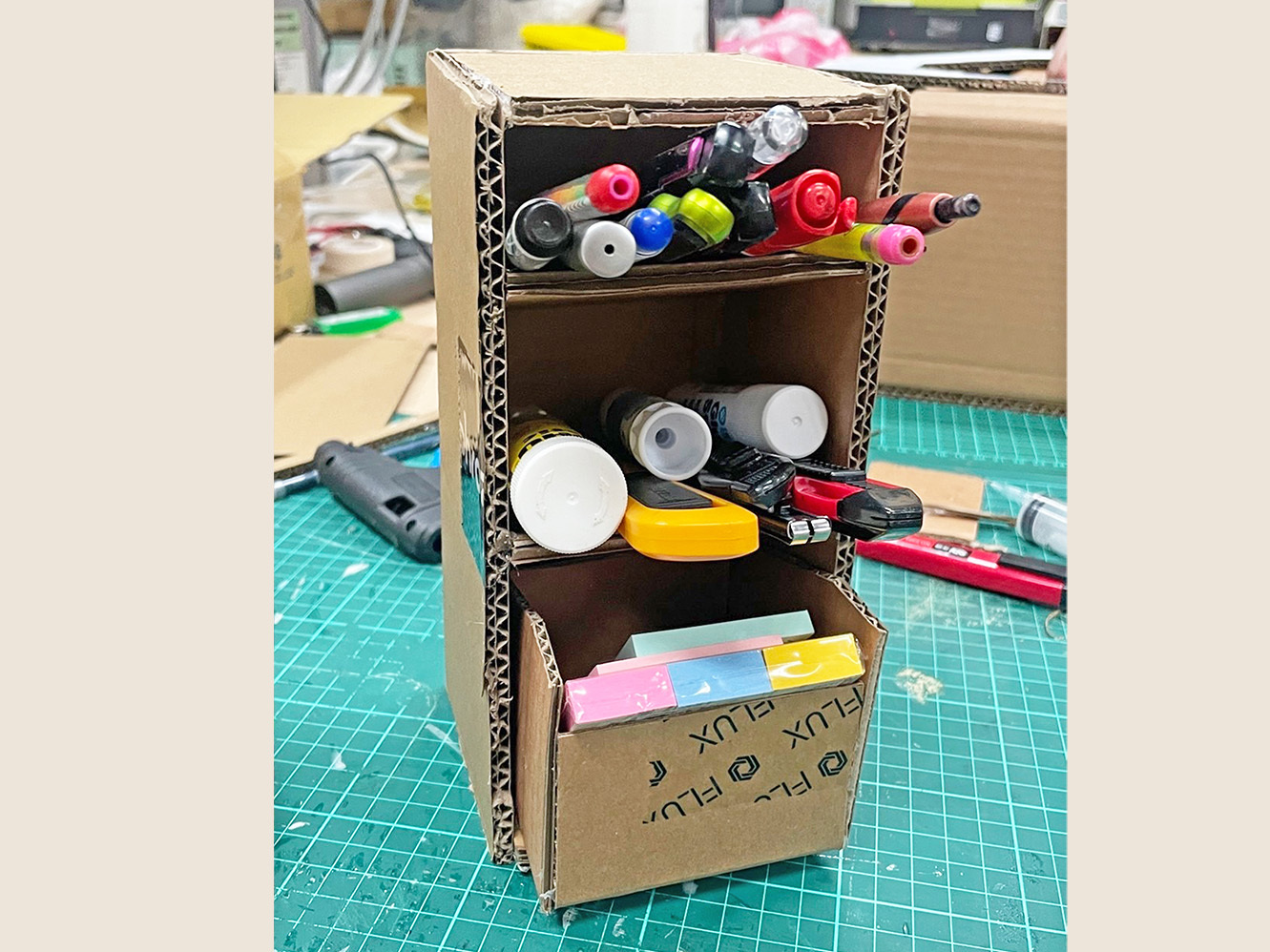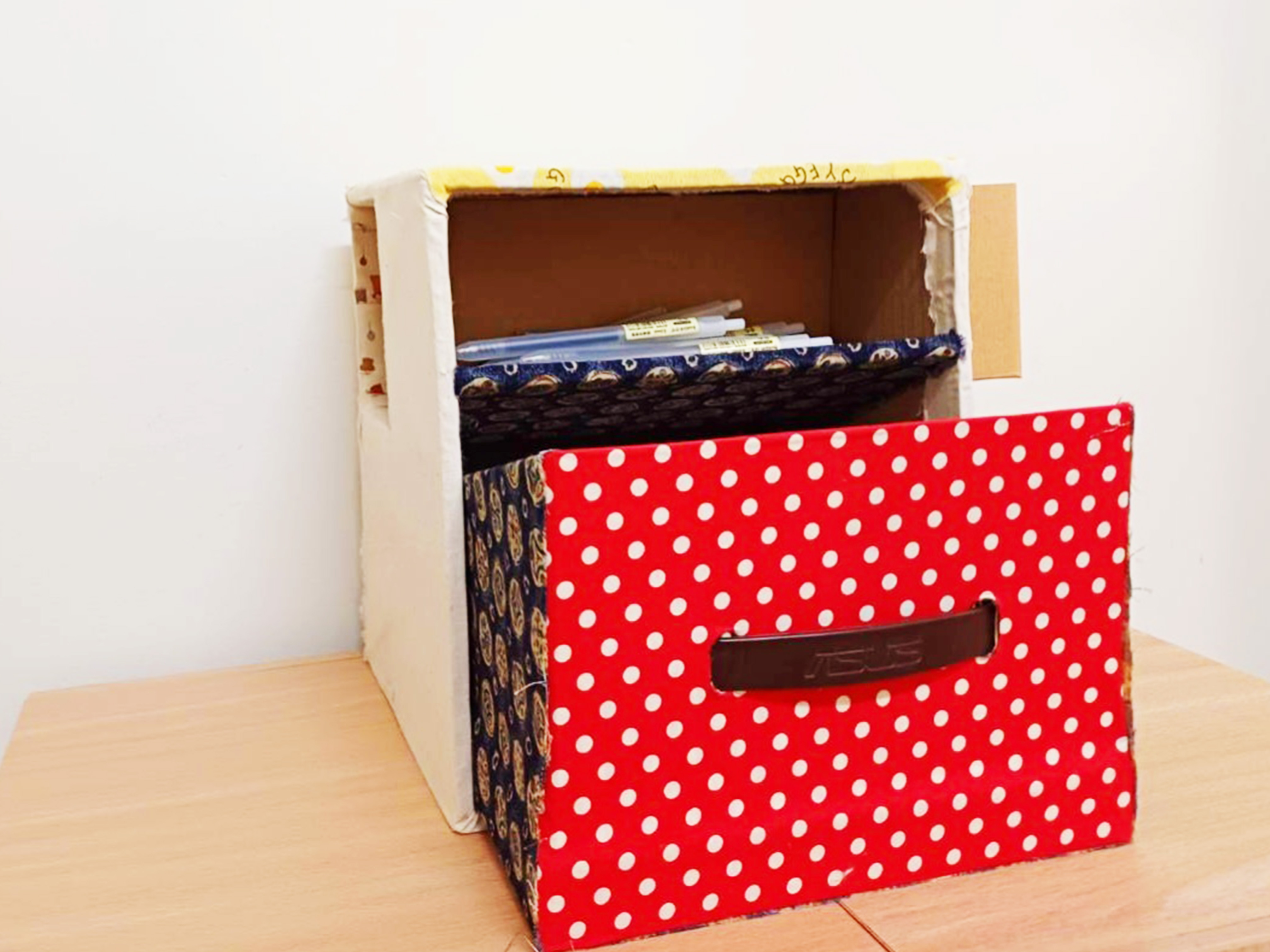 將廢棄紙箱透過裁剪黏貼後組合成收納盒,可以用於收納一些桌上小物或文具。