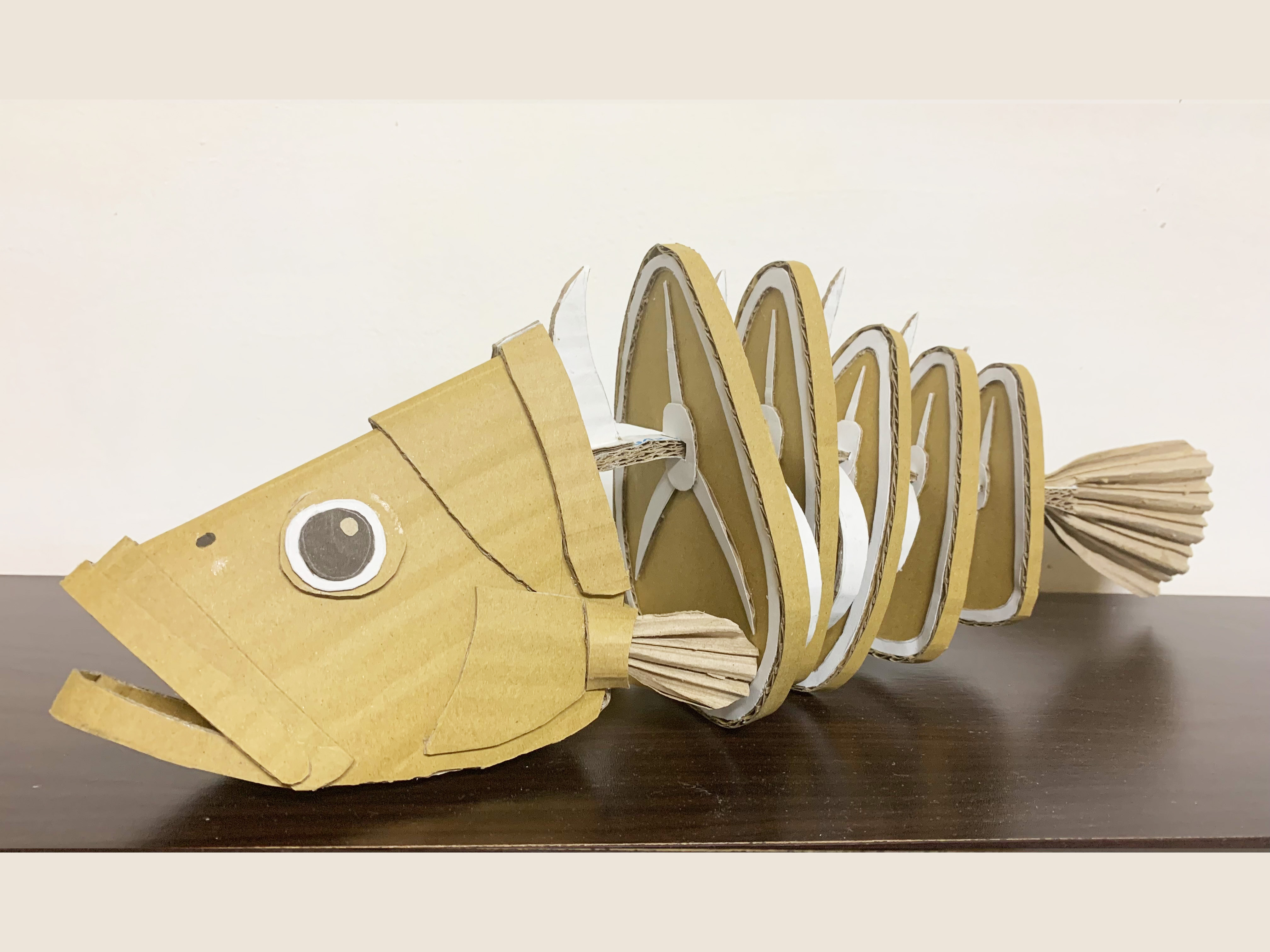 這次創作概念發想以海洋(魚)為主。材料有紙箱加上保麗龍膠製作,均無上色,以白色箱子製作魚骨頭,卡其色則為魚肉,共耗費3天時間。 工廠排放廢棄物>>浮游生物>>魚>> 人類食用魚 惡性循環的食物鏈為靈感。使用杯墊的同時能提醒自己維護海洋環境的重要性喔!
