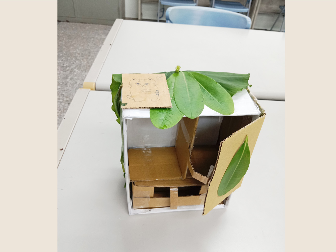 製作方式:我們選用了礦泉水紙箱作為主要材料,並以自然的樹葉點綴,以此貼近大自然的概念。我們將其打造成獨特的收納盒,堅固耐用且不貴,更重要的是能夠重複利用,突顯省錢與環保的核心價值。