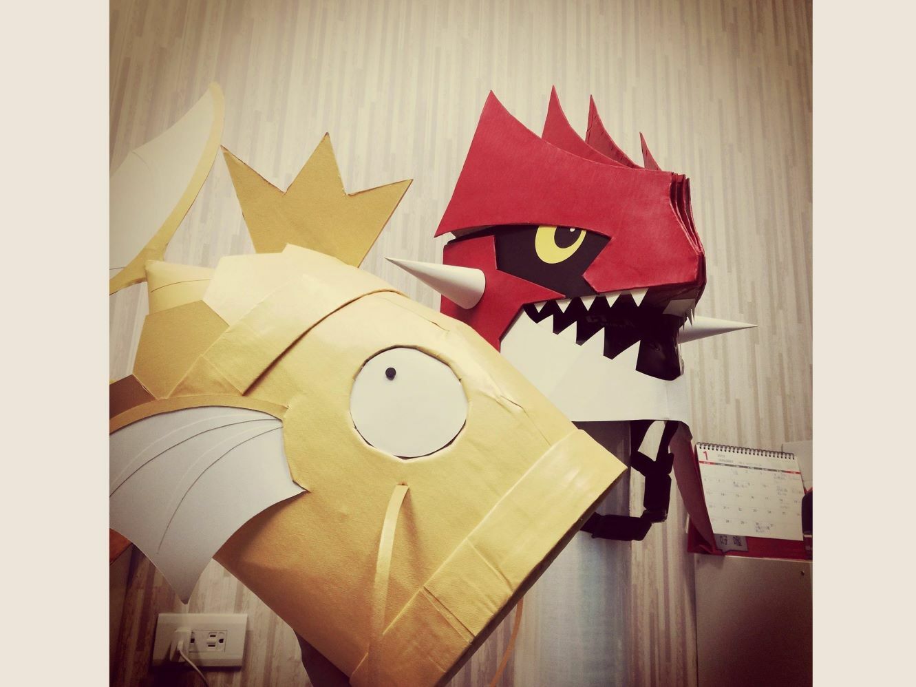 家中寶貝是恐龍迷,之前買了紙作的恐龍頭裝飾品黏在牆壁,不久被小孩撞掉落,爸爸覺得很可惜,找來寶貝一起黏貼變形上色,兩天時間製成半身恐龍裝,最後再安裝聲音效果。現在不只家中寶貝喜歡,來家裡玩的小客人都要玩上ㄧ輪,點點滴滴充滿爸爸對孩子的愛!