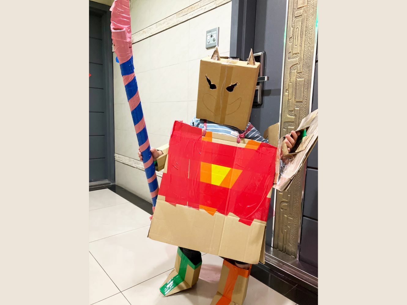 小孩萬聖節的變裝活動,不想用外面現成的裝扮,剛好家裡有幾個裝紅酒的紙箱,就跟小孩說:我們自己來做吧!所以開始進行紙箱的裁切,帶著兩個小孩開始劃線、切割、黏貼,還要隨時針對孩子的身形進行外型的微調,等整個照型確認後,再跟孩子一起完成上色的部分。完成後,果然很帥,然後我們家哥哥就說,爸比可以幫我做個武器嗎?所以我們結合美國隊長的盾牌,再來一把可以合體的武器,感覺整個就帥翻全場。