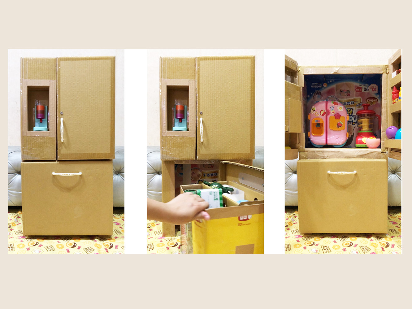 女兒說我❤️冰箱 於是把女兒的「三個尿布紙箱變身可以收納玩具的大冰箱」,紙箱切斷面與女兒一起用牛皮紙膠帶封邊;冰箱上方兩門內均設有置物層,暗嵌蝴蝶鉸鍊及磁吸扣,門片開關時有實機感,紙箱開合次數也更耐用。金屬五金都是裝修工程剩下或拆下的。 再把巧虎教具-飲品機嵌在左外門上,讓小朋友享玩扮家家酒。 下方大大的抽屜櫃也是尿布紙箱製作,把裝修工程拆下的滑輪裝設於底部,便可以隨小孩到處拖、玩、收拾玩具。