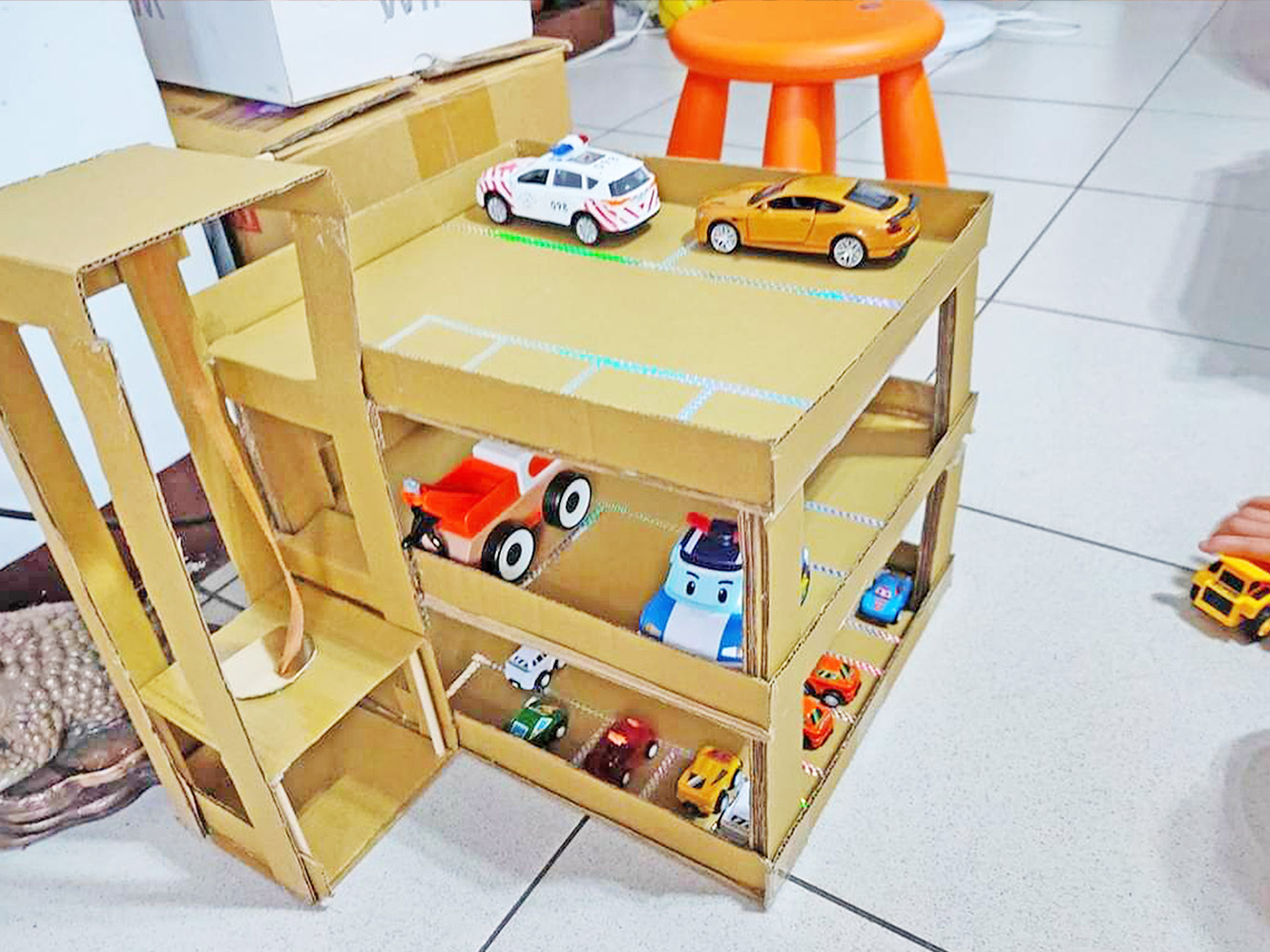 身為一個男寶媽,每天踩到小車滑倒是日常,為了讓孩子能落實收好車子這件事,媽媽變出一個停車場來,還附電梯,當媽容易嗎? 至於之後又跟我討要洗車場、加油站,又是另一個故事了
