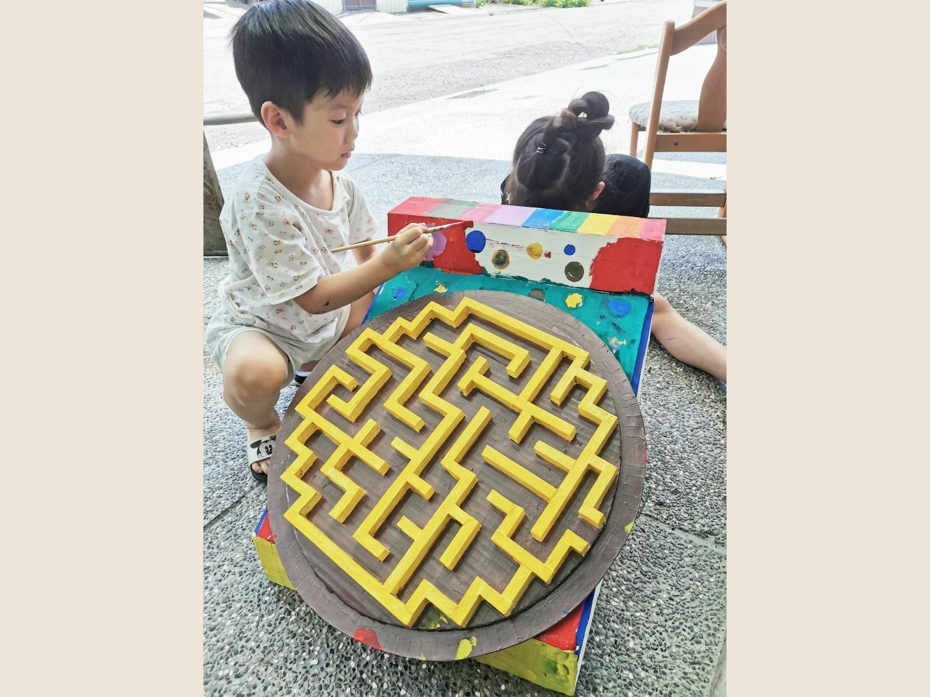 我是一位故事媽媽,剛好有位媽媽公司有一批廢棄的紙箱紙板,於是拿來廢物利用,設計了有趣的珠珠迷宮,裁切黏貼成半成品後,教導二年級班上的孩子們一起設計,讓孩子們發揮創意,自己剪貼紙條,做出好玩又環保的迷宮玩具。玩好還可以將迷宮的板子翻面,用橡皮筋套好即可收好讓珠珠不會掉出喲!