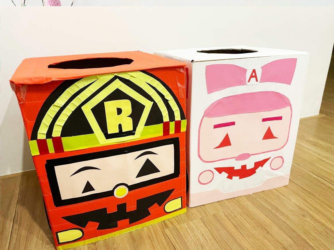紙箱是收納小幫手,但是咖啡色的紙箱太無趣了,把外觀做成安寶的樣子,增加了童趣,也讓紙箱變得繽紛,後面再慢慢完成波力和羅伊,就可以慢慢把救援小隊組起來了。