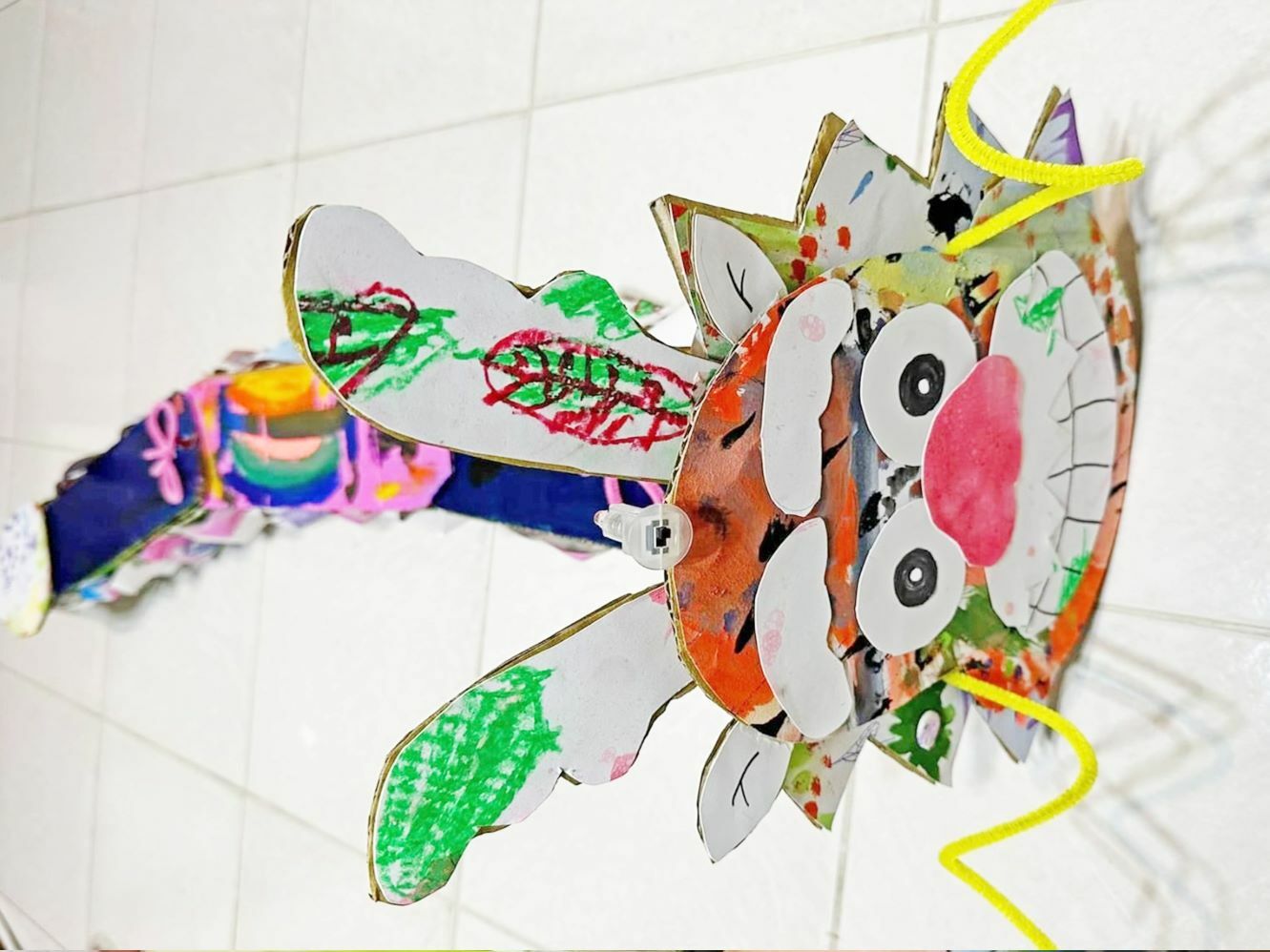 利用紙箱做二次利用,把過去畫過的畫紙加以彩繪當做龍的臉以及身上的鱗片,身體的部分也是紙箱組合成的,連接處利用毛根做連接以便轉動。可以創作用自己喜歡的顏色很開心。
