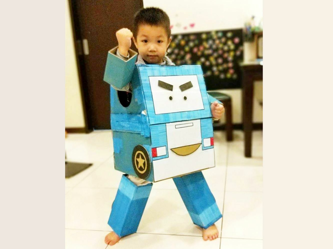 紙箱創作一直是家中爸爸熱衷的活動,這是最容易取得的素材,也是回收再利用的好資源。之前創作過整棟房子結合小孩的床,這次是模擬孩子的偶像鋼鐵人,讓寶貝穿上它,覺得自己就是帥氣的英雄,胸前不忘加上燈光照射,讓孩子還能關燈遊戲,透過紙箱創作,全家人玩得不亦樂乎,這美好的時光,我們很幸福!