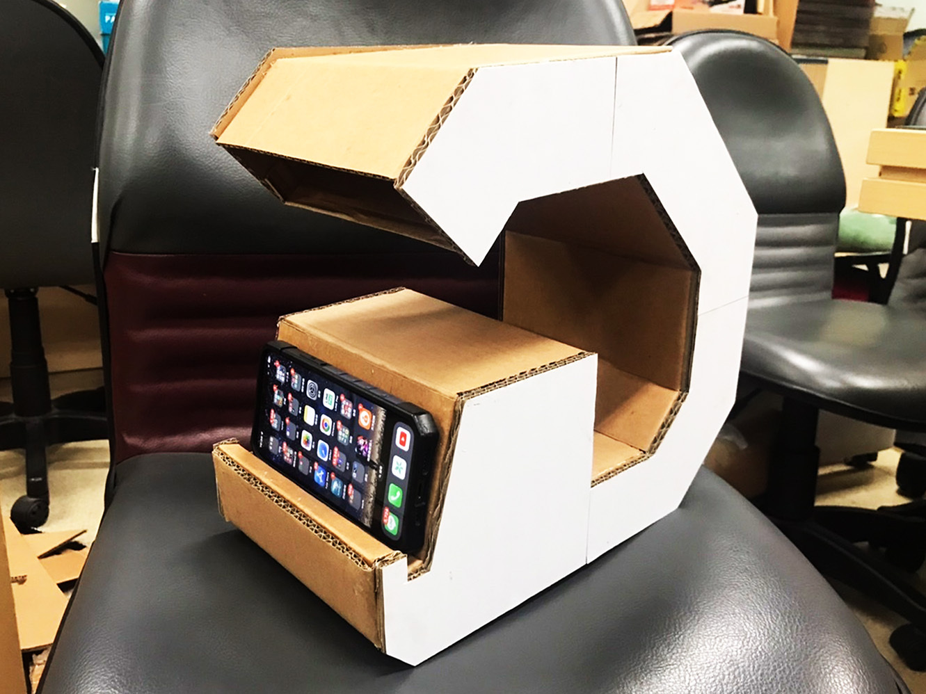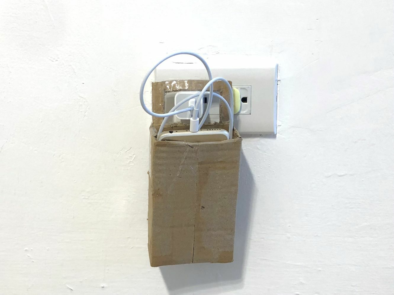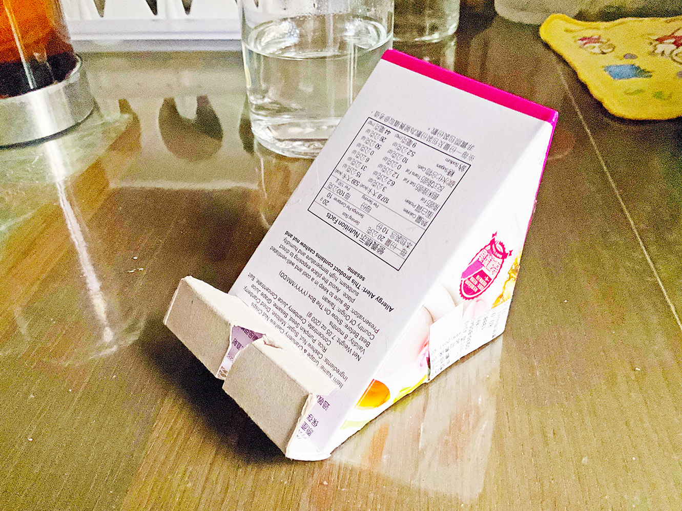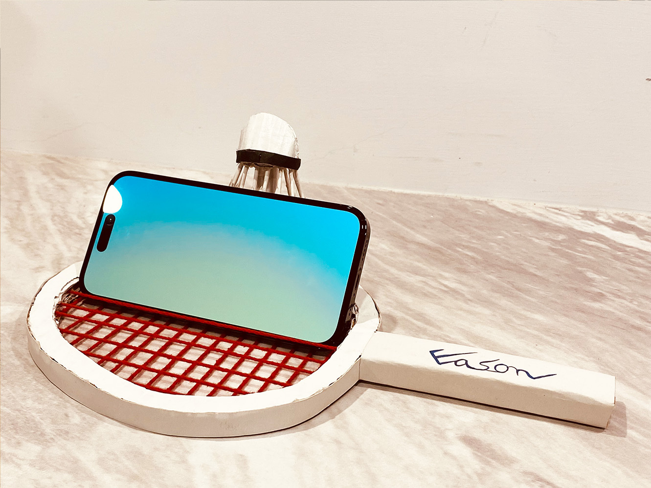 一邊追劇,一邊優雅的喝咖啡,這時需要一個手機架。我使用環保的材料「紙箱」創作出一個有別於一般市面上的手機架,除了材料環保,更是發想出運用自製的羽球支撐手機,且最酷的是將球拍線作為讓使用者調整適合手機傾斜角度的工具,不論是坐著、躺著,都可以舒服的使用手機,實用性百分百。