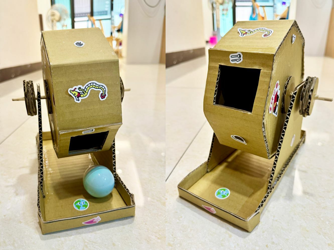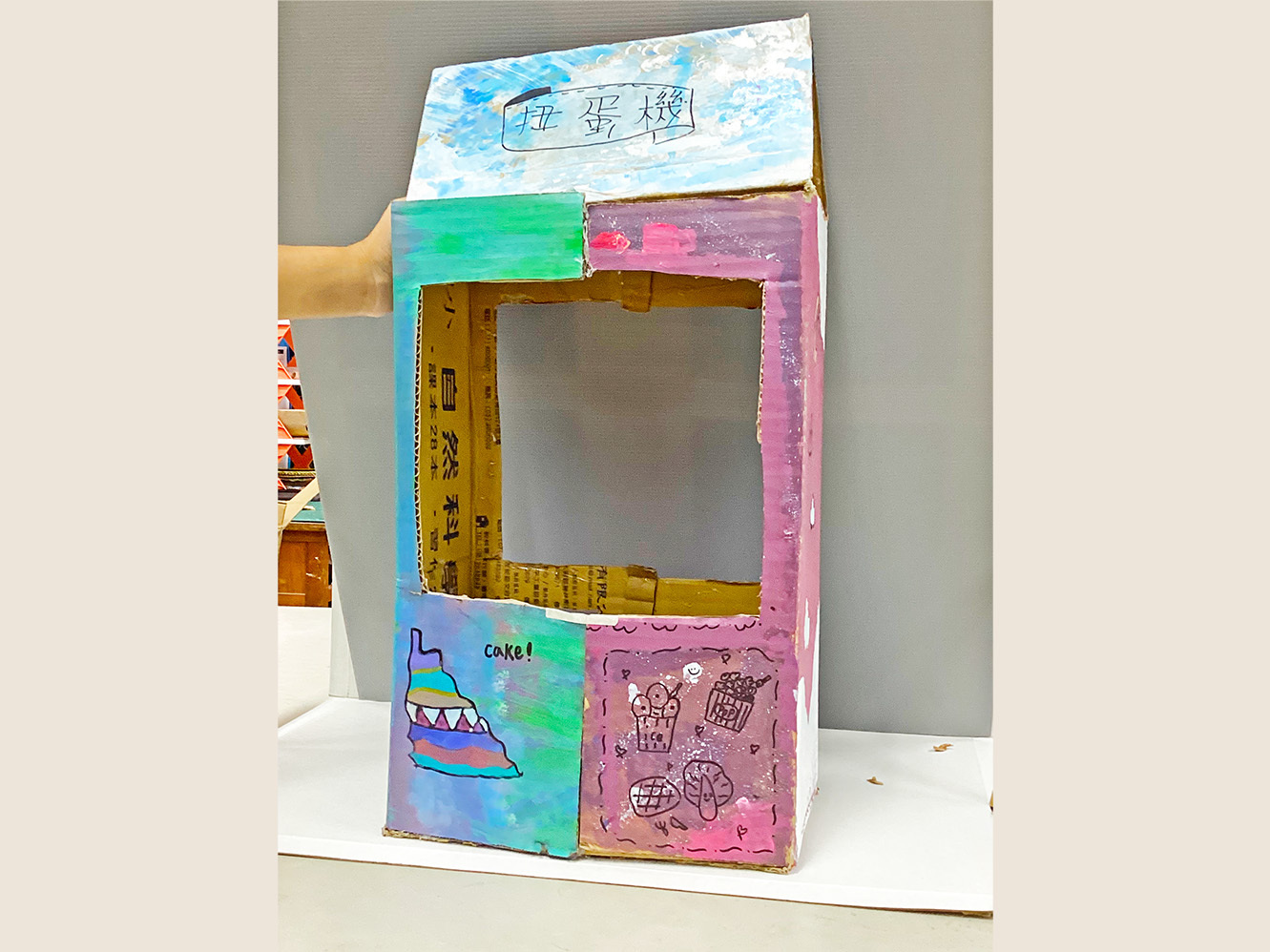 希望扭蛋機的製作,是為了參加學校閱讀書展而生的,除了介紹好看的書本,扭蛋也可以扭出希望和獎勵。 剛開始,我因為製作方式而煩惱不已,上網搜尋用簡單材料製作的說明,看到家裡也有用不到的紙箱和寶特瓶,腦袋裡不斷浮出紙板折疊和黏貼方式……經過一整天的時間,我把大箱子變身了!隔天,我歡天喜地的將扭蛋機帶去學校,果然為我們隊上的書展增添不少趣味呢!