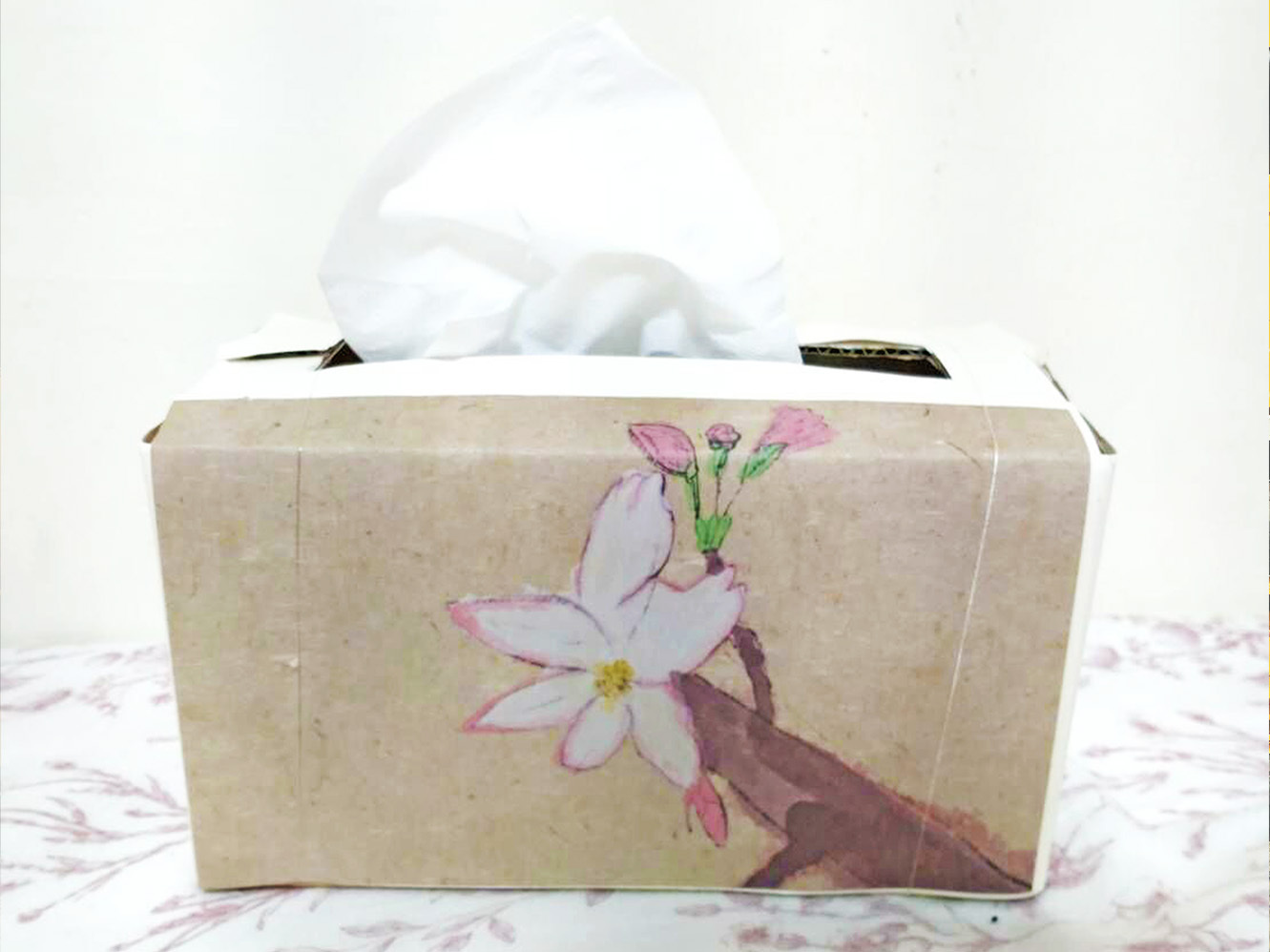 將網路電商待棄的小紙箱製作成禪風面紙盒,封面是用過期的日曆紙來包裝。為了方便能讓衛生紙整包放入,盒子上面剪開後,利用透明的水晶線去固定二側,既方便,又不失美觀。