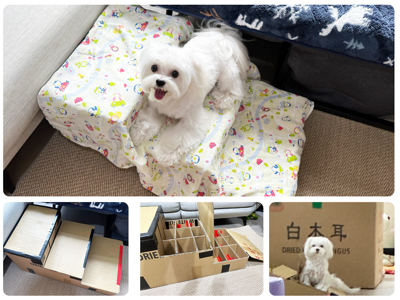 擇一卡大紙箱零損設計切割變身寵物階梯,寵物的玩具及小物隱身踏板內的空間,平常外罩孩子嬰兒時期淘汰的小棉被做鋪面,可緩衝、止滑,毛小孩非常喜歡🐶💕