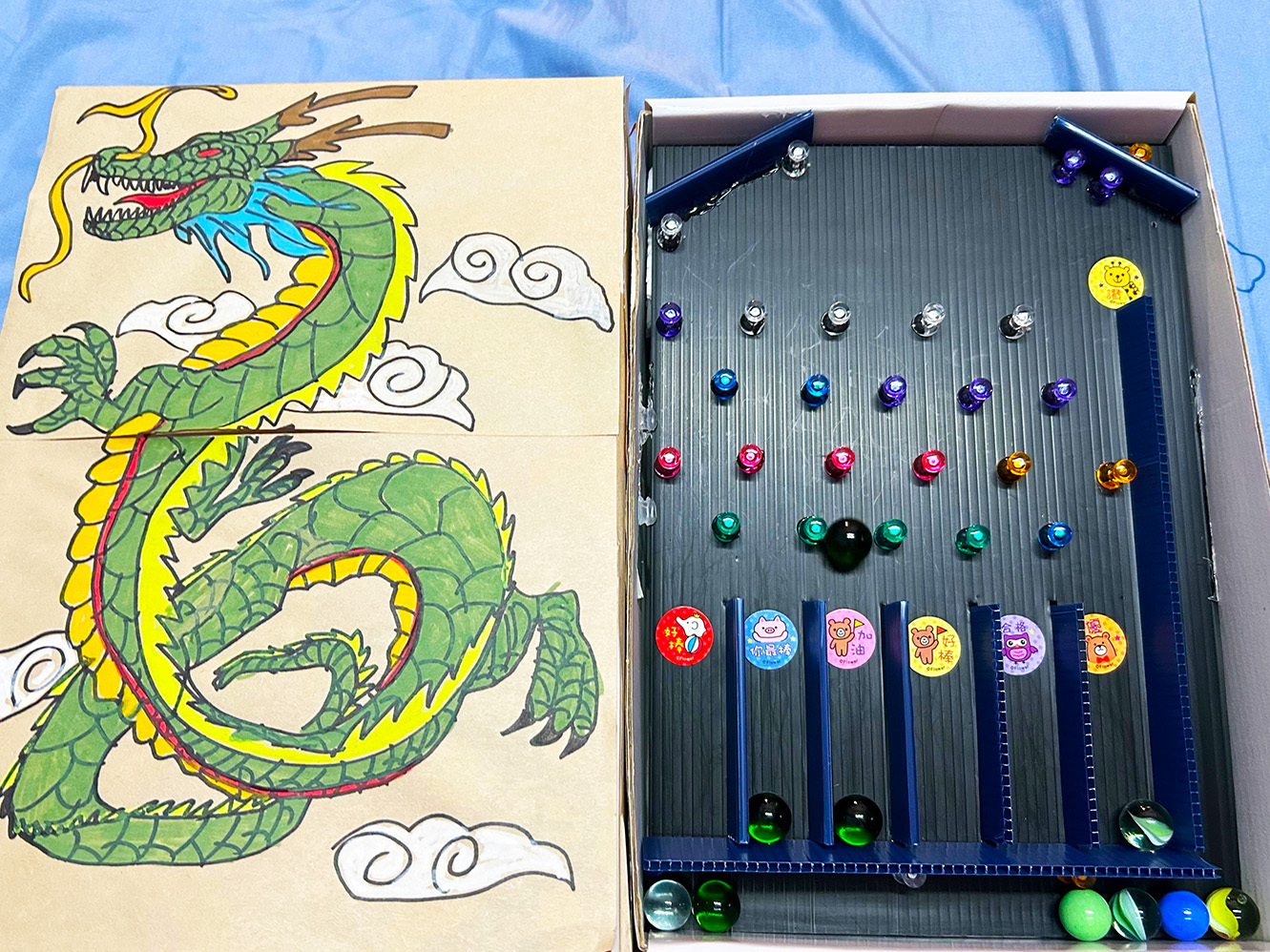 兩兄弟從小就喜歡吵著阿嬤帶她去夜市來玩打彈珠,於是我們就想到用不要的紙箱來切割組合成抽屜式的彈珠台,再用瓦楞紙來組成構造,還有用美術用的圖釘跟冰淇淋棒再配合一些彈珠跟小貼紙就完成了!小孩子順便在外盒畫上他喜歡的龍的造型,這樣就變成他專屬的抽屜式彈珠台。