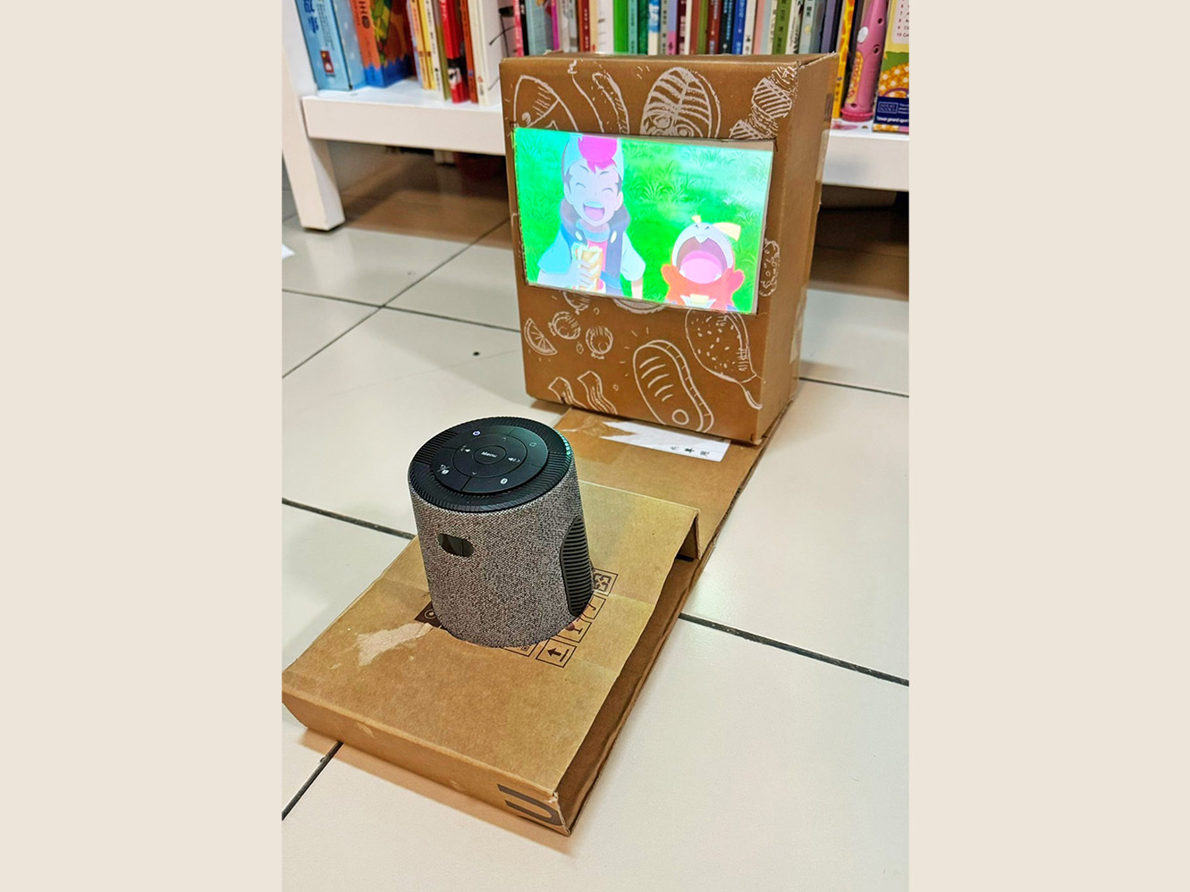 有一台小巧的無線投影機,找不到牆面投影怎麼辦呢?沒問題,運用紙箱DIY成小電視機,馬上變成我們的小劇院。