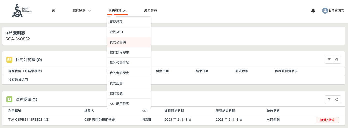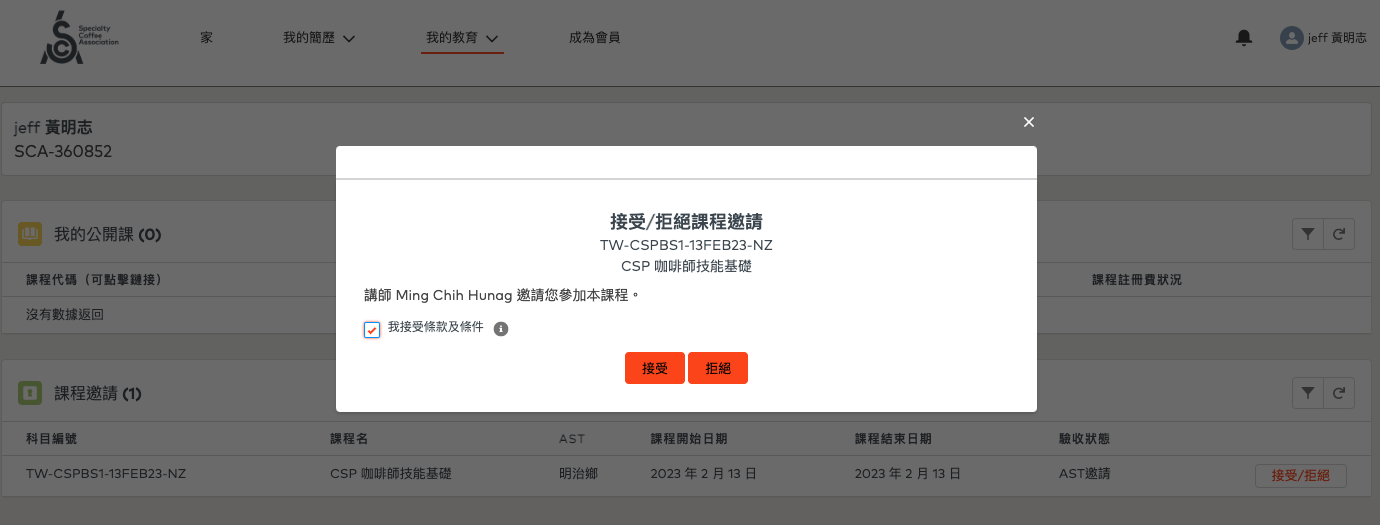3.在“Course Invitations”欄位項次,課程後面出現“Accept/Reject”(接受/拒絕)按鈕按下。