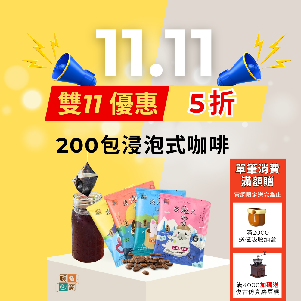 至2025-11-14T16:00:00.000+00:00截止 全店,雙11滿額贈:4000元加碼送手搖磨豆機
