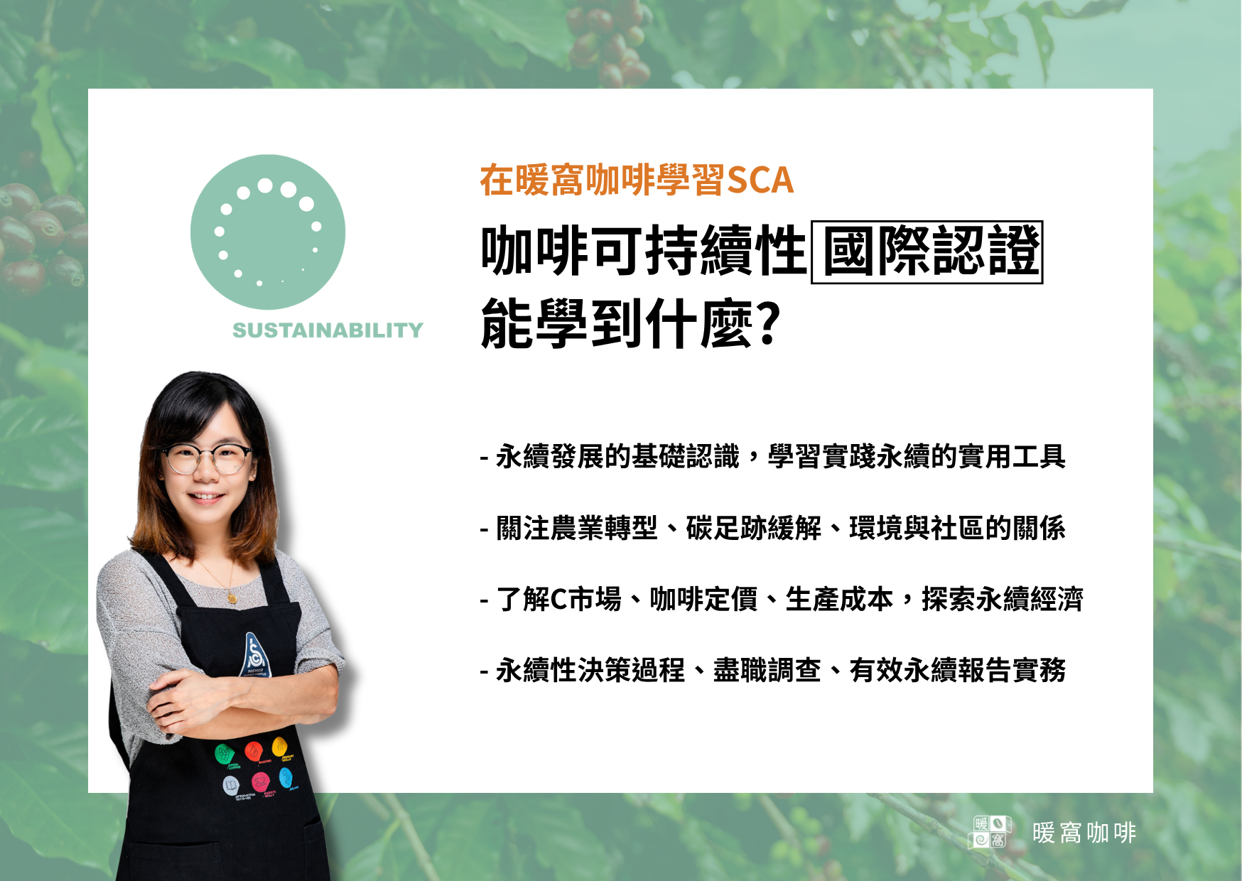 暖窩咖啡永續長(Chief sustainability officer,CSO),具備ESG永續發展管理師與ESG永續發展碳管理分析師國際ESG雙證照,用全球ESG永續發展宏觀角度,帶領您進入 SCA CSuP (Coffee Sustainability Program)咖啡永續發展管理規劃師計畫,更完整的引導您與組織思考永續議題,創造經濟循環價值鏈。
